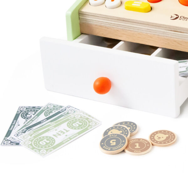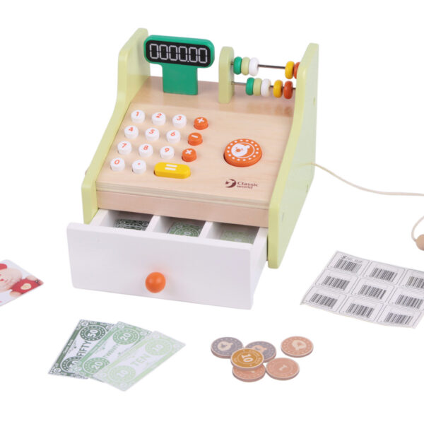 Kasa sklepowa marki Classic World to świetna drewniana zabawka, która pozwoli na odegranie wielu scenek, jakie mogą mieć miejsce w sklepie. Dzieci mogą wcielić się w role kasjera lub klienta oraz wspólnie ćwiczyć interakcje społeczne, oraz swoje zdolności komunikacyjne. Gotówka czy karta? Policz sumę należności, przyjmij pieniądze i wydaj poprawnie resztę. Kasa zawiera banknoty, monety oraz kartę płatniczą. Dziecko może uczyć się bawiąc! Królowa Nauk – matematyka nie będzie już straszna.