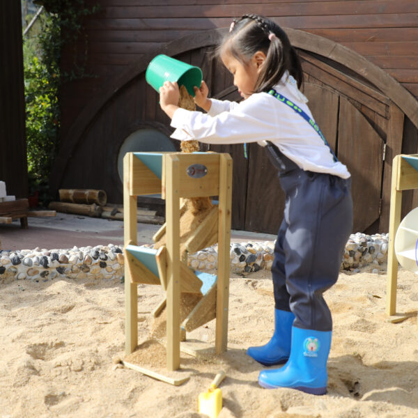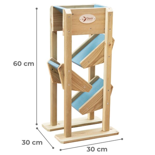 Drewniana Zjeżdżalnia Na Piasek od marki CLASSIC WORLD to dobrej jakości zabawka, która idealnie dopełni piaskownicę twojego dziecka, ale także place zabaw w placówkach edukacyjnych. Składa się ona z lejka umieszczonego na samej górze, do którego dziecko wsypuje piasek, który następnie po 3 małych zjeżdżalniach zlatuje na dół. Używanie tej drewnianej zjeżdżalni to świetna zabawa sensoryczna dla dziecka, która dobrze wpływa na małą motorykę.