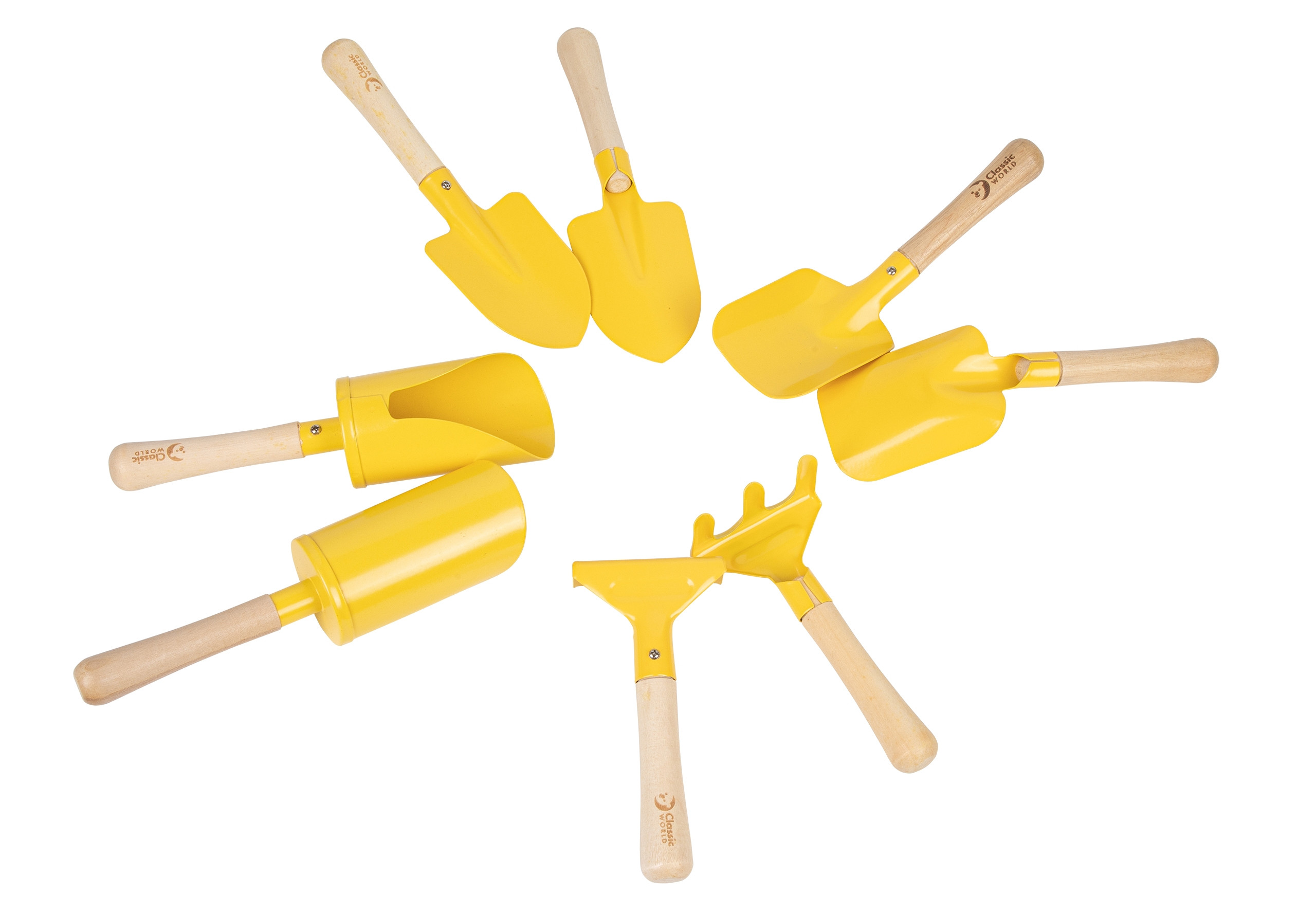 - – Narzędzia wykonane z wytrzymałego metalu w intensywnym żółtym kolorze oraz drewnianych uchwytów