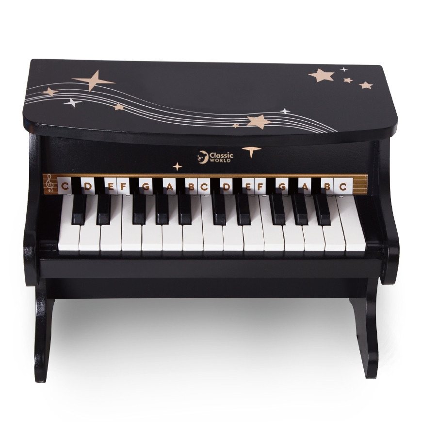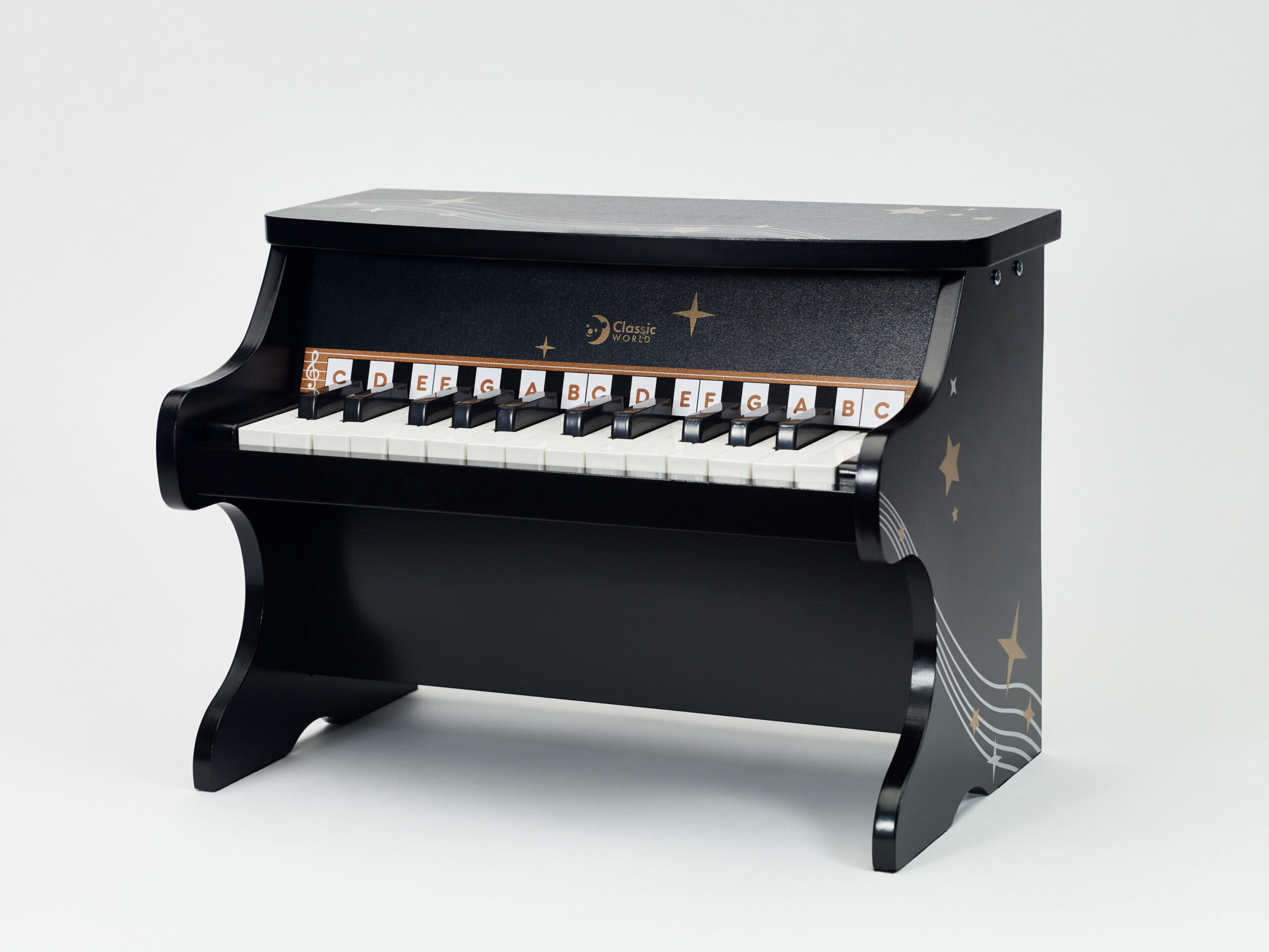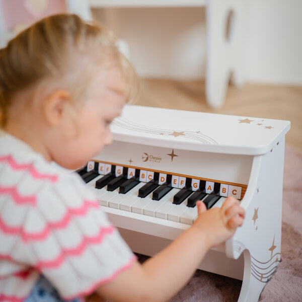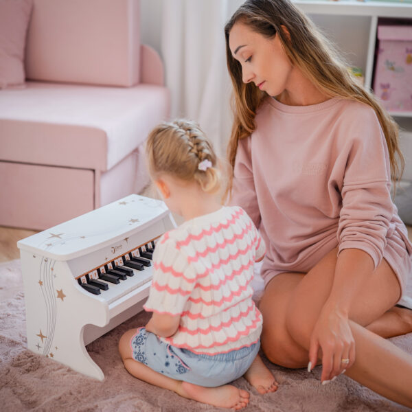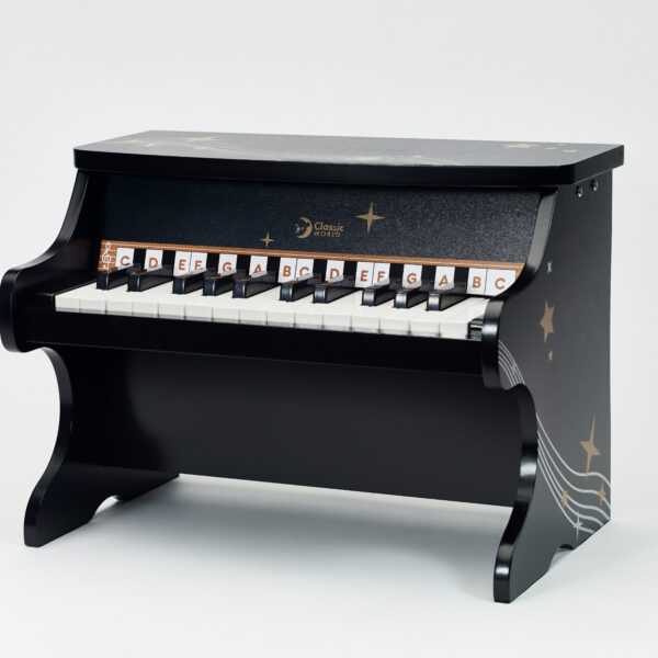 Drewniane Czarne Pianino Fantasy od marki CLASSIC WORLD to wyjątkowy instrument muzyczny, który pozwoli Twojemu dziecku odkryć świat melodii i dźwięków. To piękne, drewniane pianino zostało zaprojektowane z myślą o małych rączkach, umożliwiając początkującym wirtuozom tworzenie własnych kompozycji. Instrument charakteryzuje się przyjemnym brzmieniem, które nie męczy ucha, a jednocześnie zachęca do dalszej zabawy. Wykonane z najwyższej jakości materiałów, pianino jest nie tylko trwałe, ale i w pełni bezpieczne dla maluchów. Zabawka muzyczna to doskonały sposób na rozwijanie wrażliwości artystycznej oraz zdolności sensorycznych już od najmłodszych lat.
