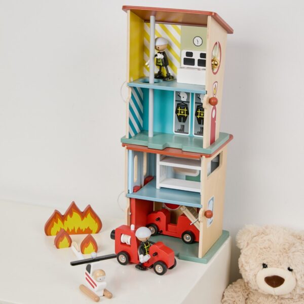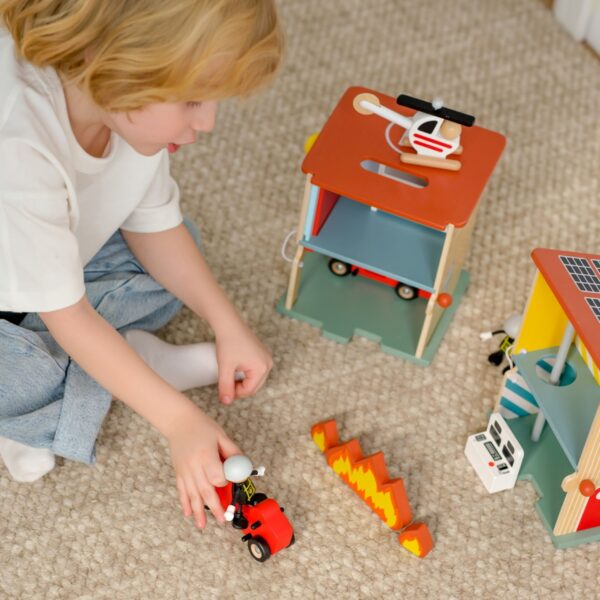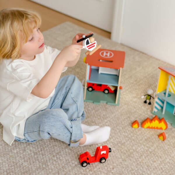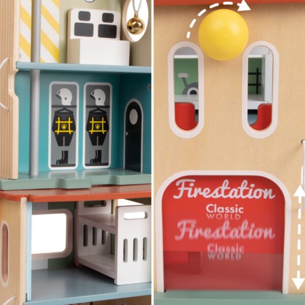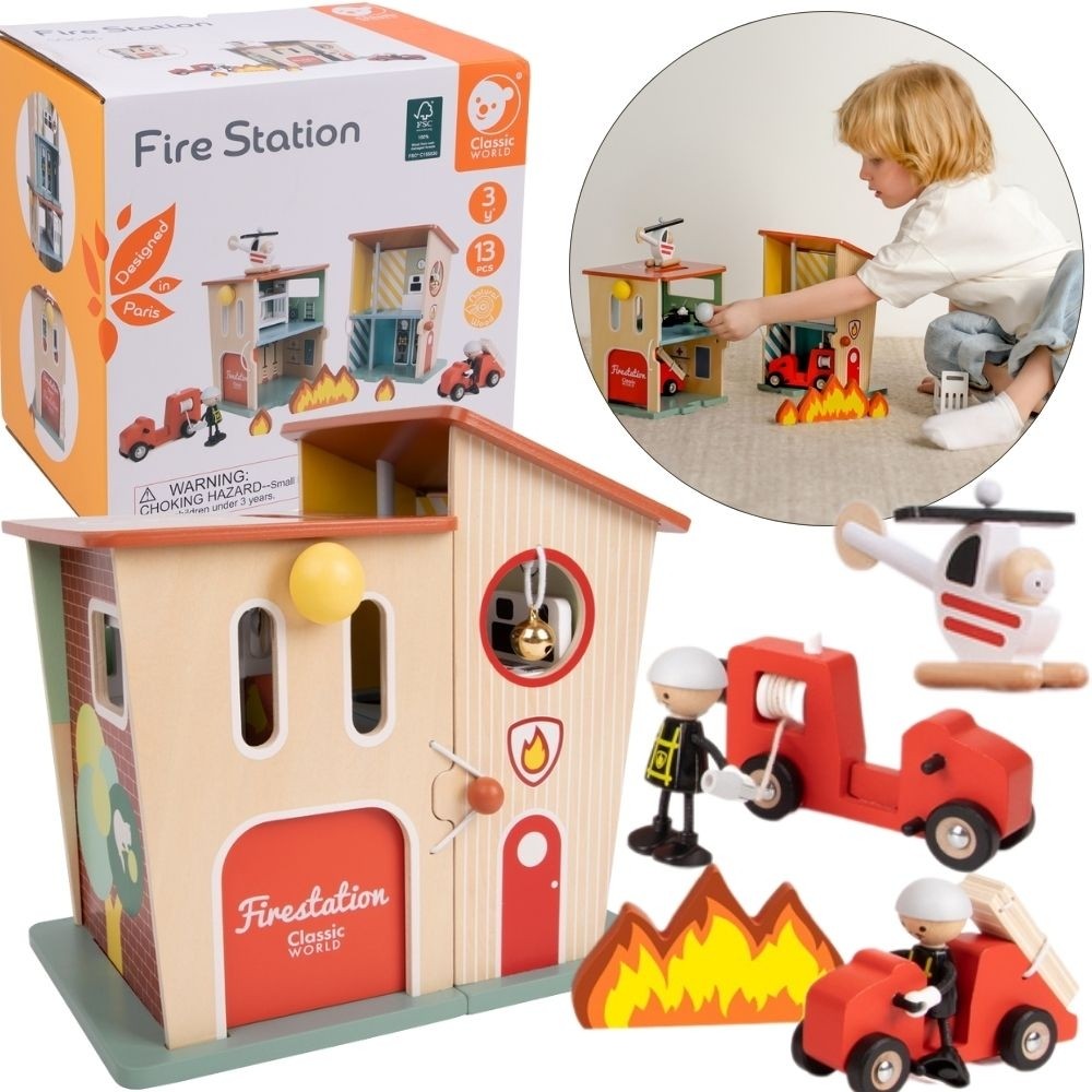 CLASSIC WORLD Remiza Strażacka Drewniana Garaż Auto Helikopter Figurki 13el.