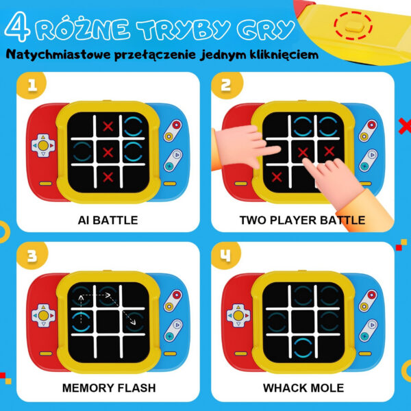 Nowoczesna elektroniczna gra w Kółko i Krzyżyk to połączenie klasycznej zabawy z najnowszą technologią, oferująca nieskończone godziny edukacyjnej rozrywki dla całej rodziny. Kolorowa konstrukcja z dotykowym wyświetlaczem sprawia, że każda rozgrywka staje się niezwykle angażująca, a dodatkowe tryby gry zapewniają różnorodną rozgrywkę w pojedynkę lub z drugą osobą.