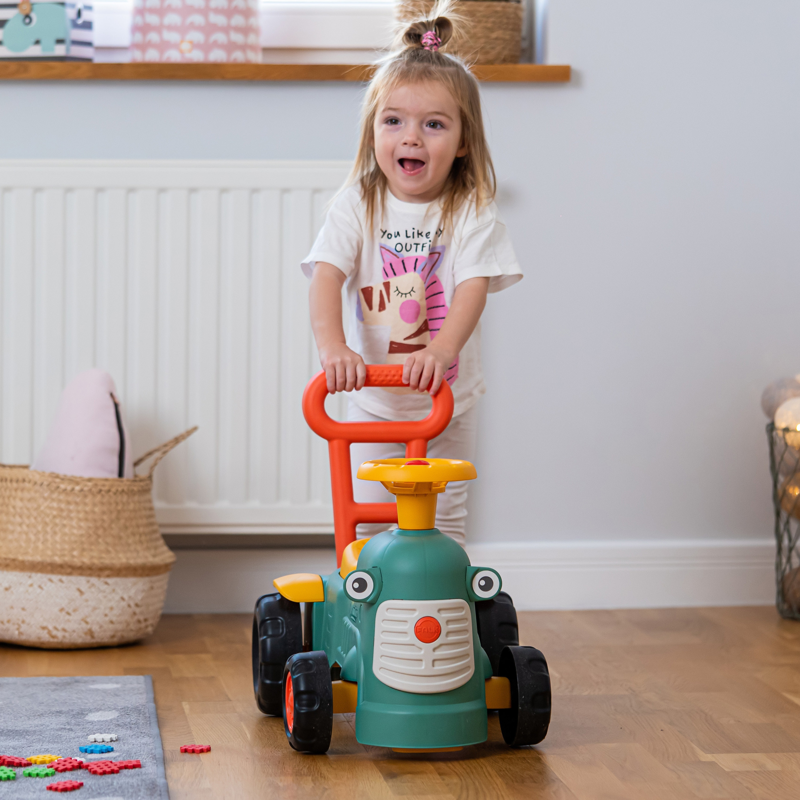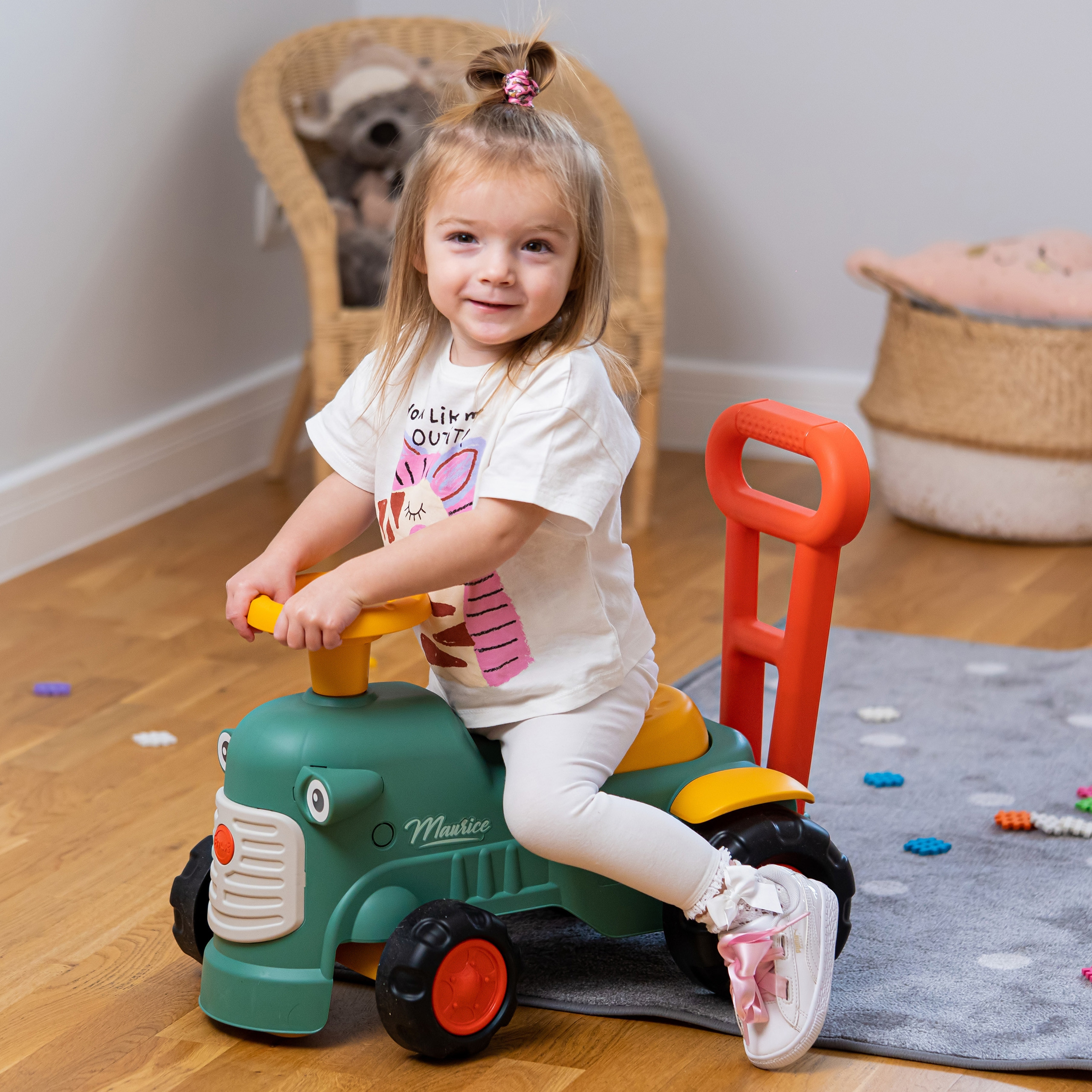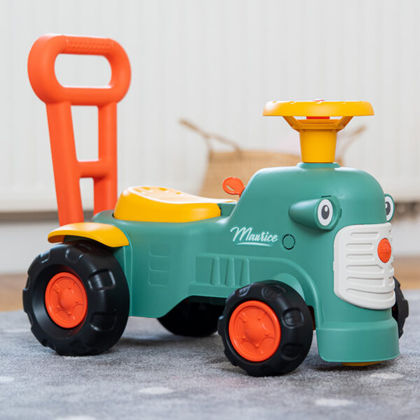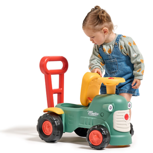 Uroczy i pełen pomysłowości jeździk traktorek Maurice to idealny towarzysz dla dzieci od 12 miesięcy aż do ich pierwszych kroków. Dzięki specjalnej ergonomicznej rączce pomaga maluchom w nauce chodzenia i stawianiu pewnych kroków. Ten wyjątkowy pojazd został wyprodukowany we Francji z wykorzystaniem co najmniej 90% plastiku pochodzącego z recyklingu. Posiada kierownicę z klaksonem, otwieraną skrytkę na skarby, dźwiękowy kluczyk oraz skrętne koła, co gwarantuje mnóstwo angażującej zabawy każdego dnia. Zabawka jest w pełni bezpieczna dla najmłodszych, ponieważ nie zawiera szkodliwych substancji takich jak BPA, ftalany ani PVC.