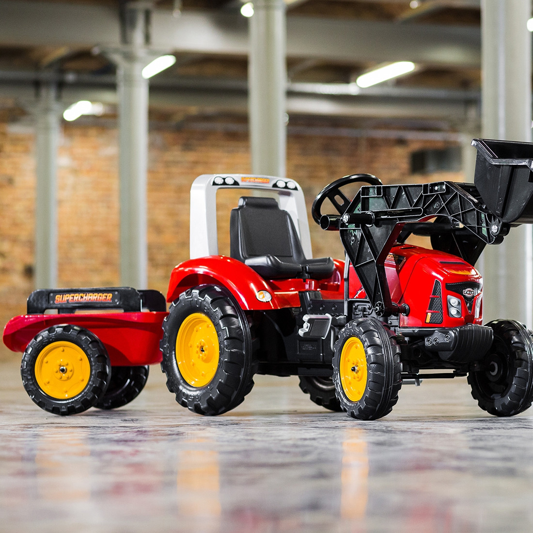 FALK Traktor na pedały z przyczepą Red Supercharger FALK to spełnienie marzeń niejednego małego traktorzysty. Starannie wykonany, z dbałością o najmniejszy szczegół! Żaden Farmer by takim nie pogardził. Pojazd wykonany z najwyższej jakości tworzywa przeznaczony dla dzieci w wieku od 3 lat. Pojazd jest wyposażony w przednią łyżkę oraz odpinaną przyczepę z panelami i kierownicę z klaksonem. Koła traktorka zostały wykonane z wysokiej jakości plastiku. Traktor posiada również otwieraną maskę z imitacją prawdziwego silnika.