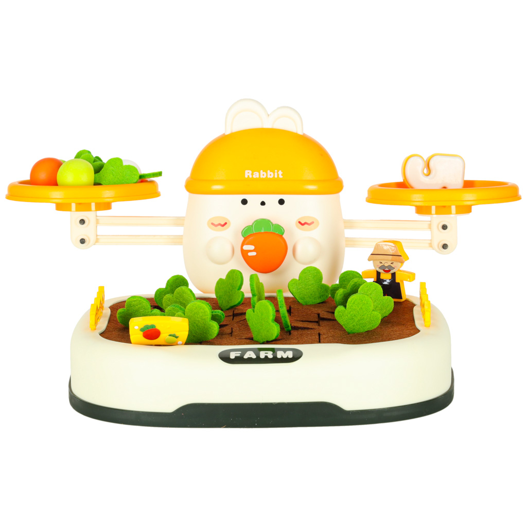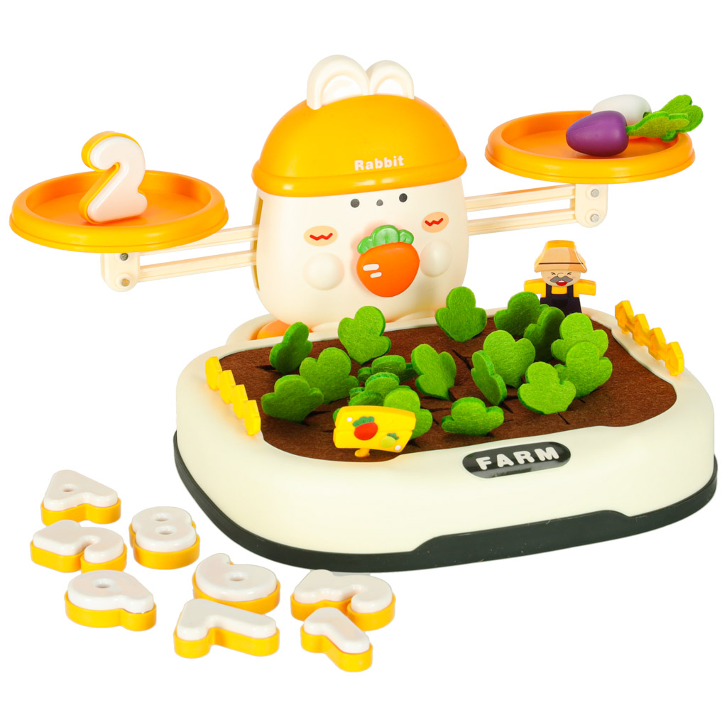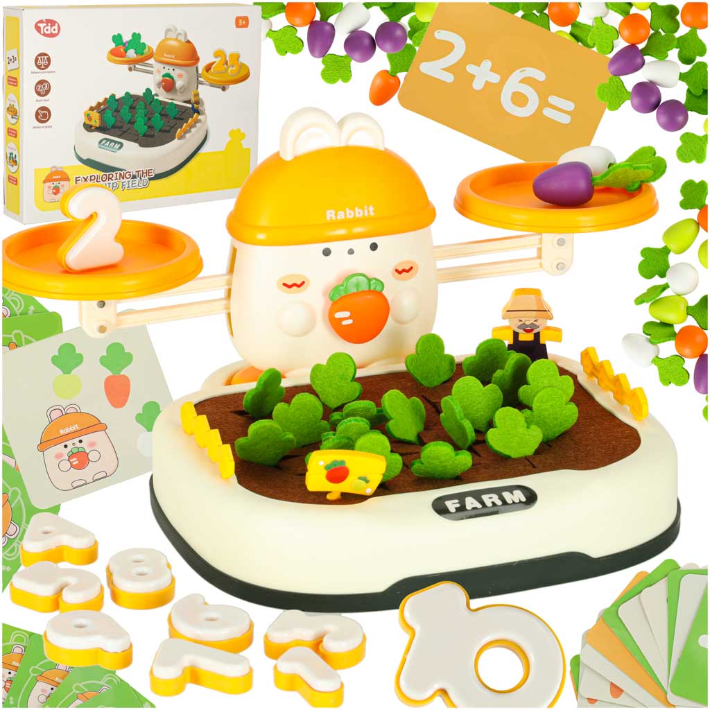 Edukacyjna gra sensoryczna dla dzieci od 3 roku życia. Zestaw rozwija logiczne myślenie, motorykę i koordynację. Zawiera cyfry o różnych wagach, warzywa, karty, wagę, tacki, naklejki i dekoracje w formie farmy. Nauka przez zabawę!