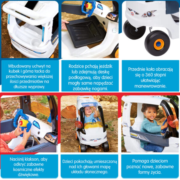 Przygotuj się na międzygalaktyczną przygodę! Kultowy Cozy Coupe w kosmicznej odsłonie od Little Tikes to jeździk, który przeniesie Twoje dziecko w świat wyobraźni, aktywnej zabawy i pierwszych podróży. Idealny do jazdy w domu i w ogrodzie – pełen funkcji, które zapewniają bezpieczeństwo i radość maluchom od 18 miesiąca życia.