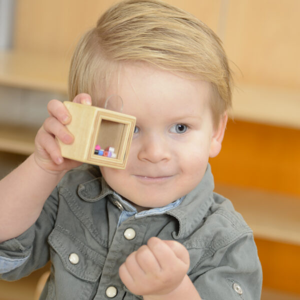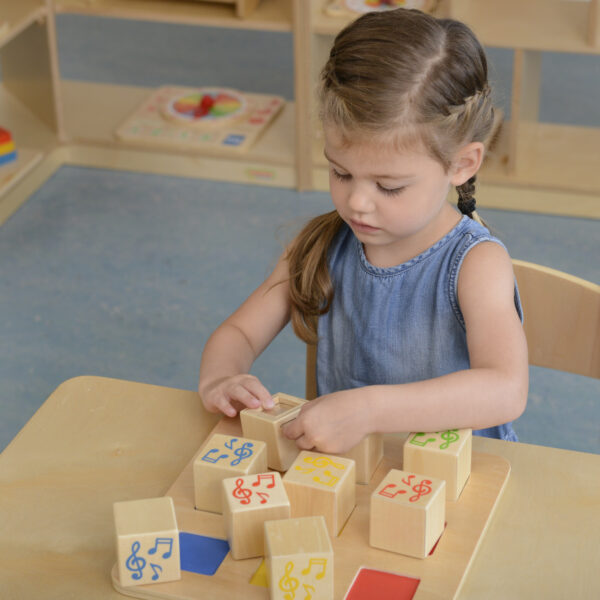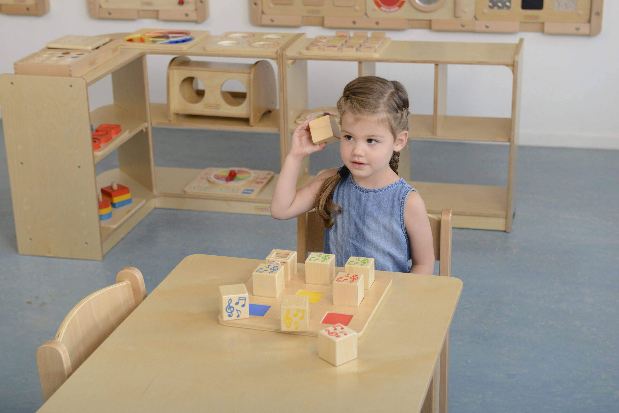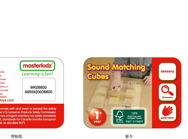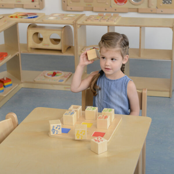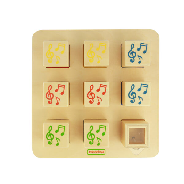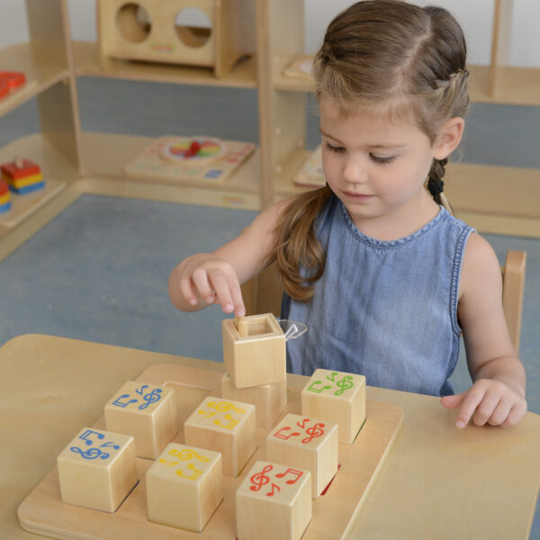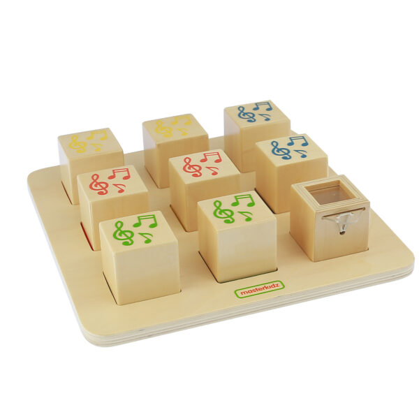 - – Zestaw składa się z planszy, oraz ośmiu drewnianych kostek, które wydają różne dźwięki podczas potrząsania. Zadaniem dziecka jest dopasowanie kostek w pary, sugerując się wydawanymi dźwiękami. Należy odnaleźć pary kostek, które wydają taki sam dźwięk.
