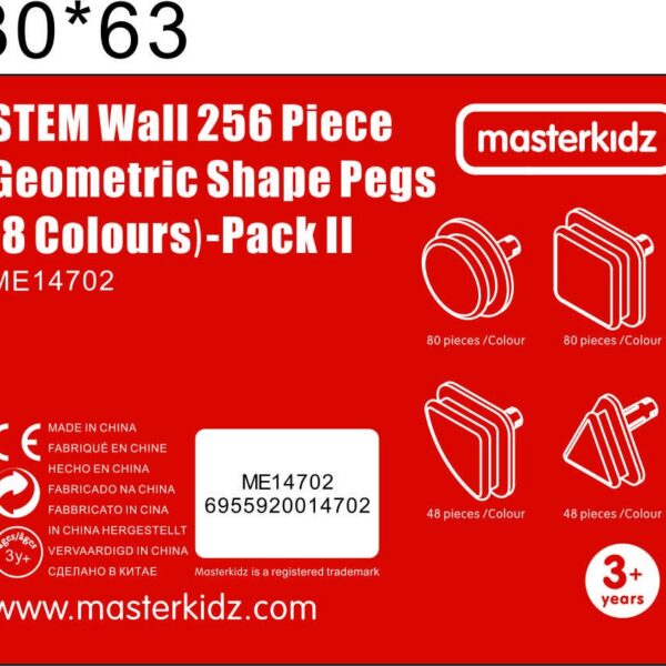 Wielokolorowe, plastikowe kołki w kształcie figur geometrycznych do tworzenia fantastycznych, bajkowych wzorów. Są jednym z najpopularniejszych elementów uzupełniających kreatywne tablice Masterkidz. Zestaw akcesoriów do tablicy STEM – zawiera 256 elementów w 4 kształtach i 8 kolorach, które mogą stworzyć nieograniczoną liczbę twórczych obrazów.