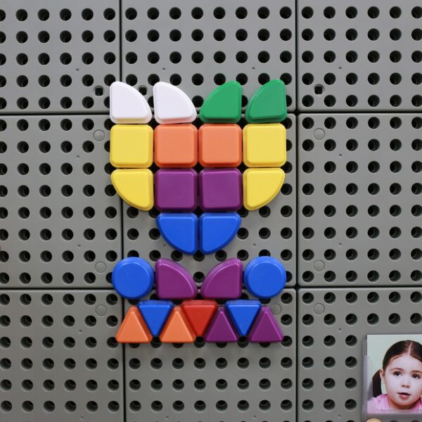 Ta tablica edukacyjna skupia się na rozpoznawaniu kształtów i motoryce małej. Jest podzielona na dwie części: górna zawiera pasek zadań, w którym dzieci muszą umieścić trzy kształty (czerwony sześciokąt, niebieski kwadrat i żółte koło) w odpowiednich miejscach. Dolna część planszy to trzy kolumny z 9 kształtami, które dzieci muszą dopasować do właściwych miejsc, koncentrując się na kolorze i kształcie. Elementy są umieszczone na tablicy w sposób umożliwiający ich łatwe przesuwanie, ale niemożliwe do zgubienia. Tablica może być używana na biurku lub zamontowana na ścianie.