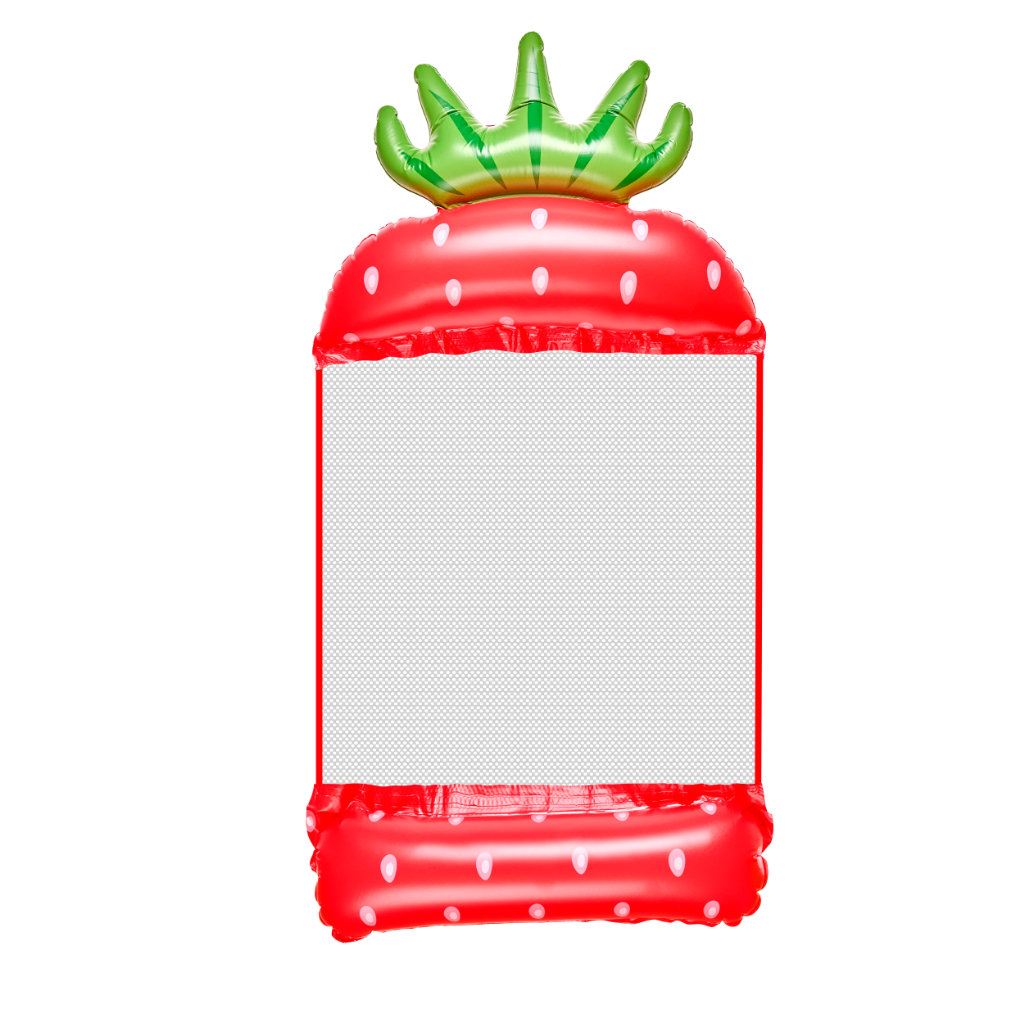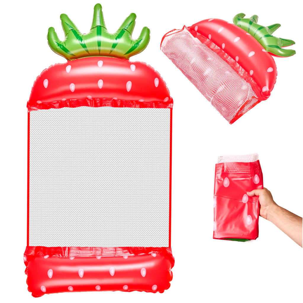Materac wodny dmuchany w kształcie truskawki, funkcja hamaka z siatką PVC. Wymiary: 140×70 cm, max obciążenie 70 kg. Ergonomiczny, stabilny, lekki, łatwy do pompowania, kompaktowy po złożeniu. Do basenu, jeziora, morza.