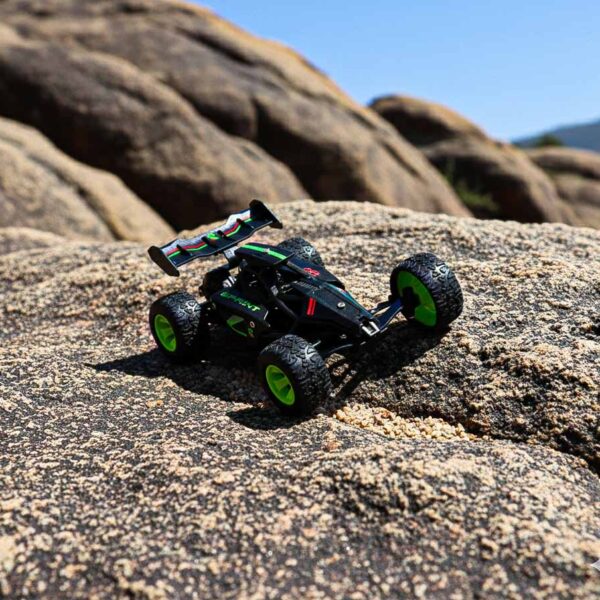 Mini auto RC RTR z kontrolerem zdalnego sterowania w zestawie. Gotowy do jazdy od razu po rozpakowaniu – ma zasięg sterowania do 30 metrów i sprawnie porusza się po trudnej nawierzchni. Dla dzieci od 6 rż. i dorosłych. Wymiary: 11,5 x 8,5 x 5 cm