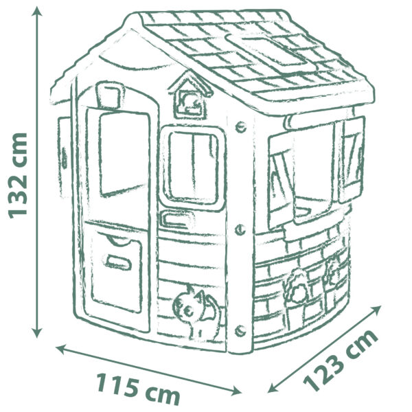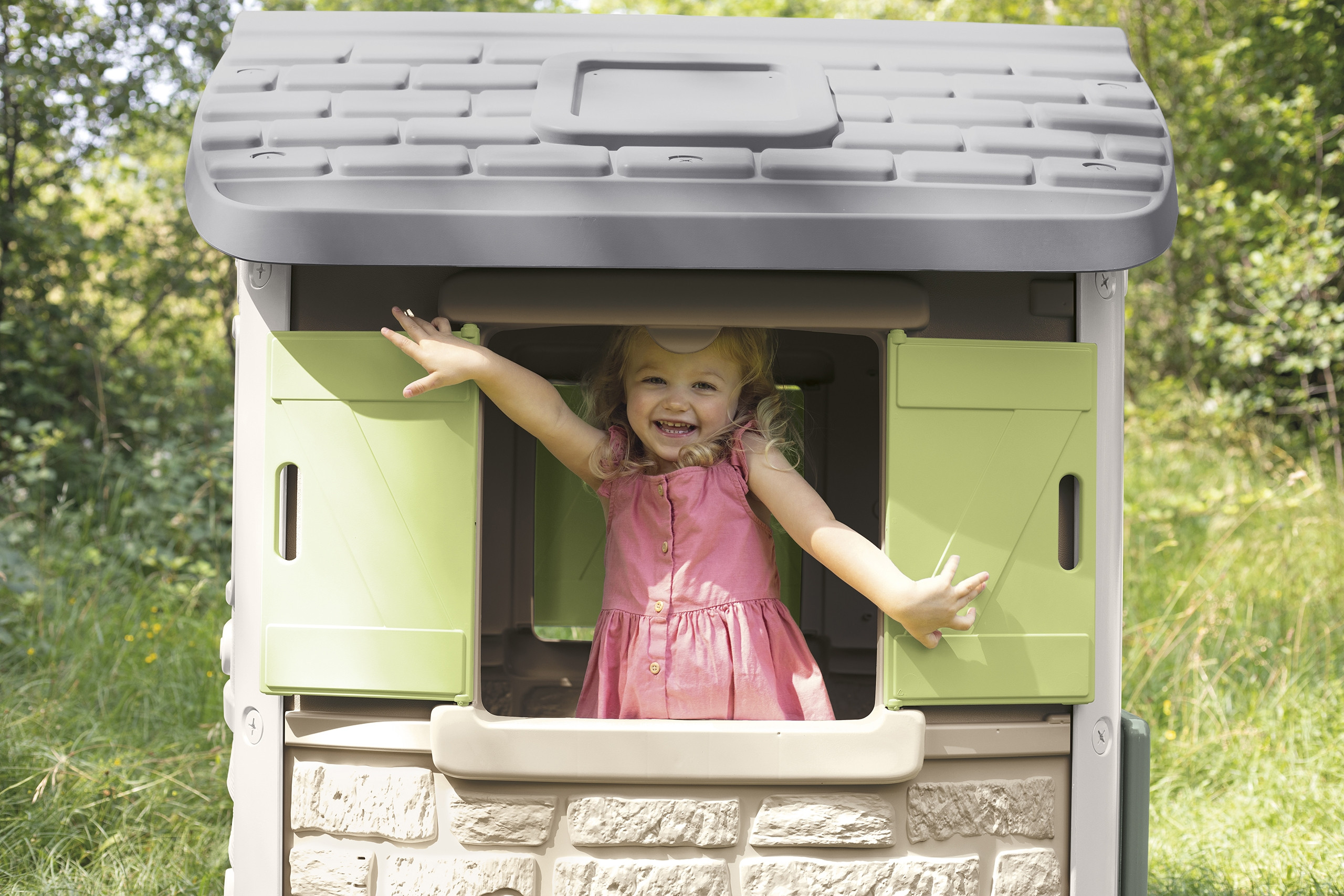 - – Możliwość rozbudowy – kompatybilny z dodatkowymi akcesoriami Smoby, takimi jak stół piknikowy, parasol, dzwonek do drzwi czy prysznic ogrodowy.