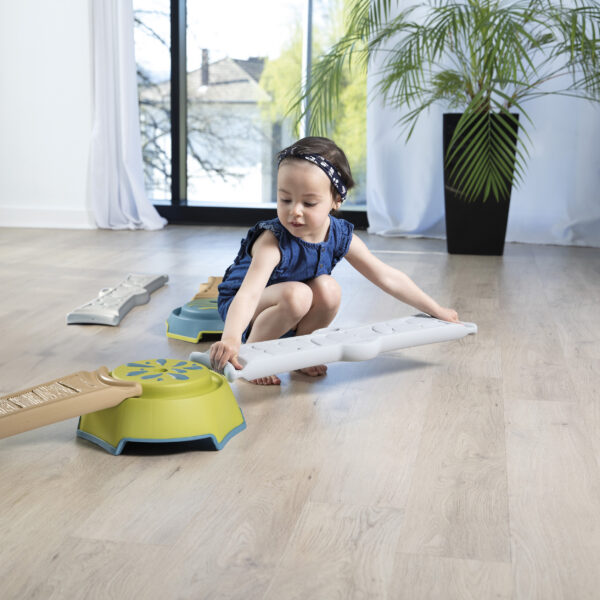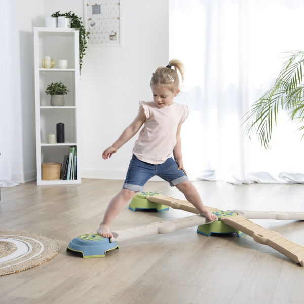 Zestaw składa się z czterech długich (70 cm) paneli o zróżnicowanej fakturze oraz czterech podstaw do ich mocowania. Możliwość dowolnej konfiguracji elementów pozwala stworzyć nawet 3,5-metrową trasę, dostosowaną do umiejętności dziecka. Ścieżkę warto przechodzić na boso, co zwiększa doznania sensoryczne i pozytywnie wpływa na rozwój układu nerwowego.