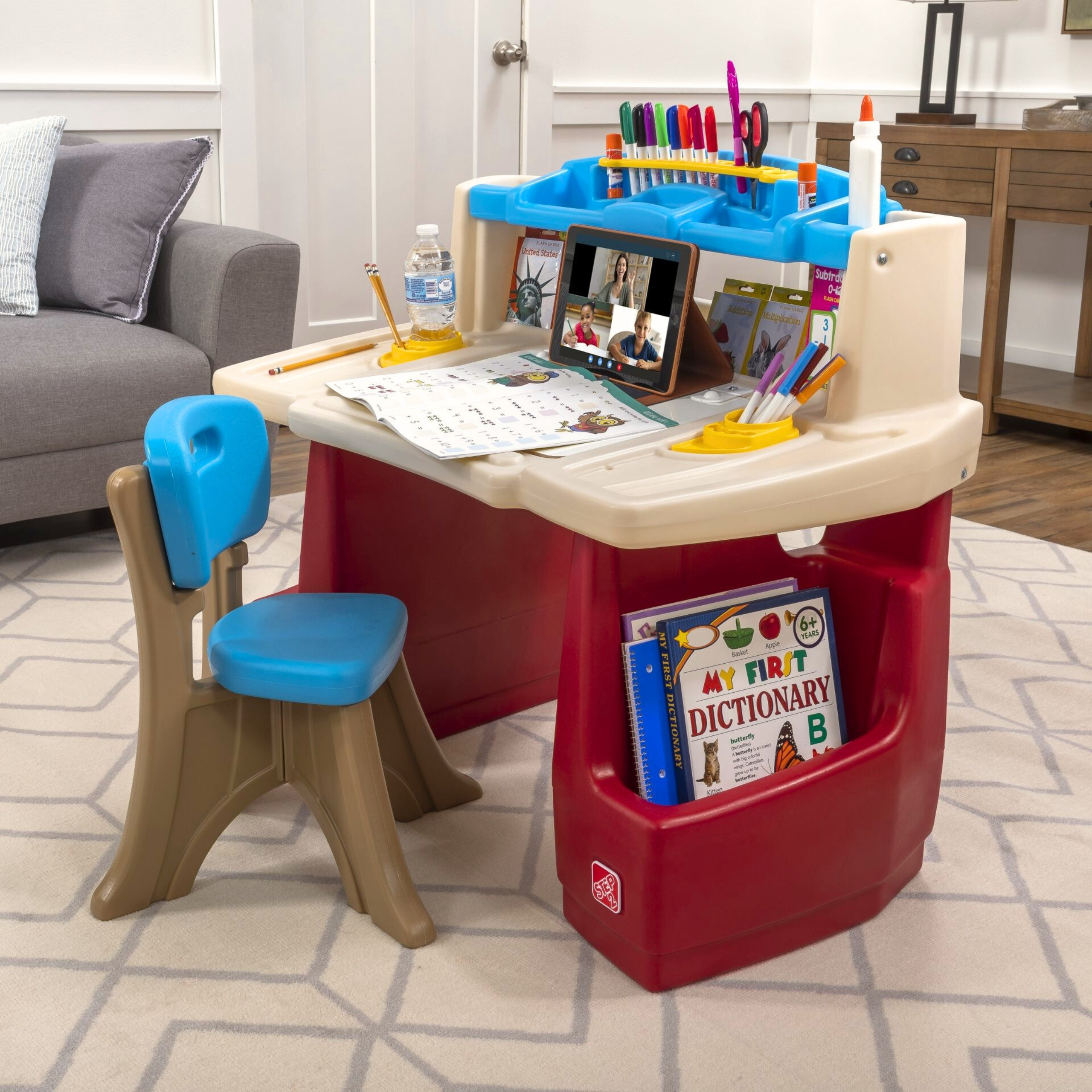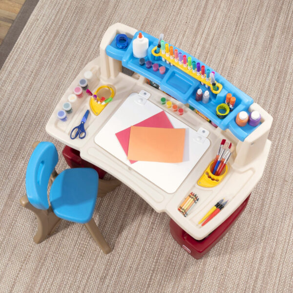 Biurko Deluxe Art Master Desk marki Step2 to idealne miejsce do twórczej zabawy i nauki! Kolorowy, funkcjonalny zestaw z biurkiem i krzesełkiem rozbudzi wyobraźnię dziecka oraz pomoże rozwijać zdolności manualne. Doskonały wybór do pokoju dziecięcego lub kącika zabaw