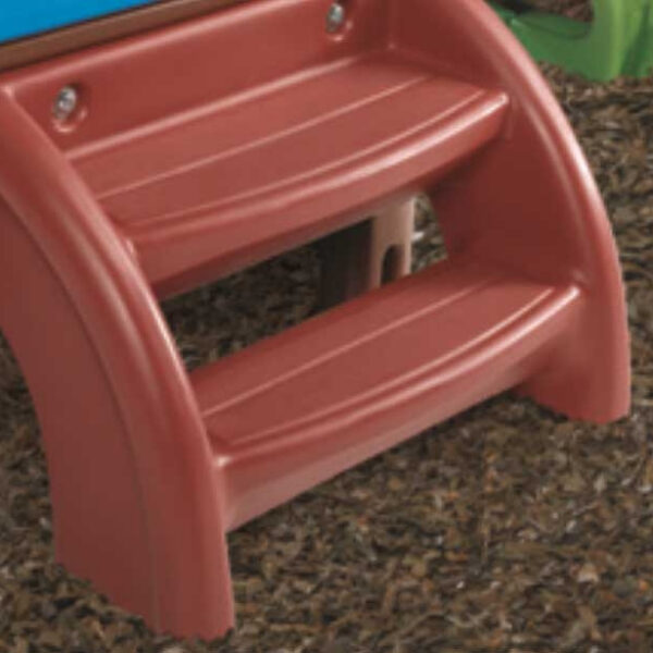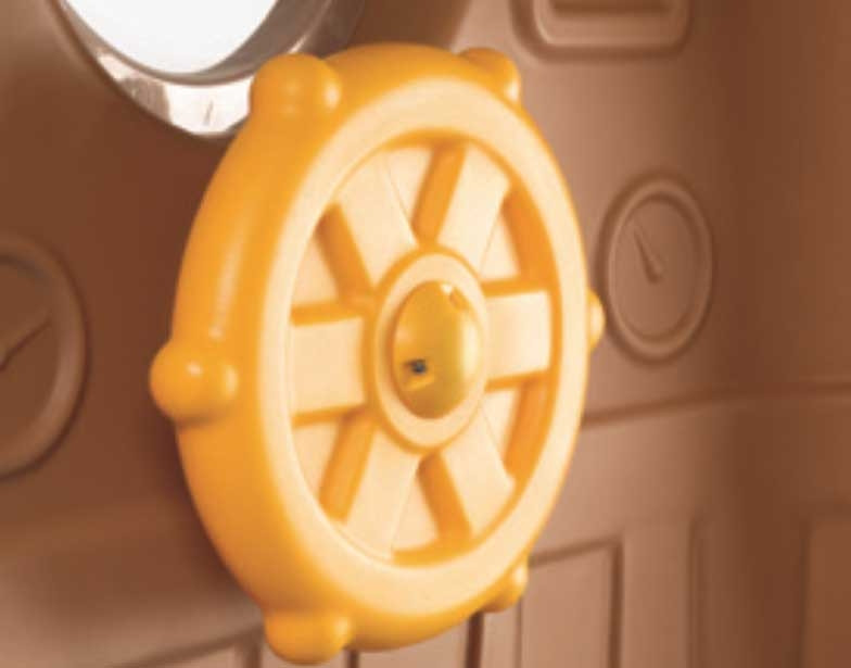 - – Domek posiada drabinkę o dużych stopniach, poręcz pomagającą we wspinaczce, okrągłe okno, świetlik, koło sterowe oraz łagodną zjeżdżalnię o długości ślizgu 98 cm prowadząca do kryjówki pod spodem.