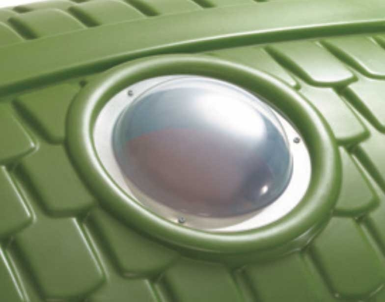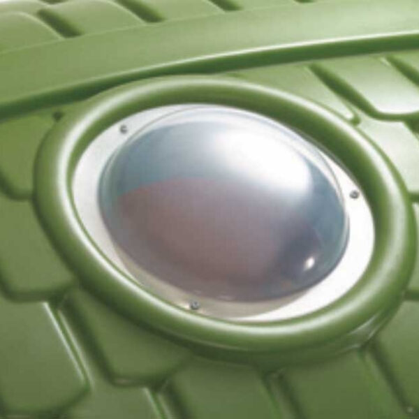 - – W wieży strażniczej znajduje się okno – świetlik oraz druga zjeżdżalnia o długości ślizgu 98 cm, a w dolnej jej części kryjówka z tunelem do czołgania.