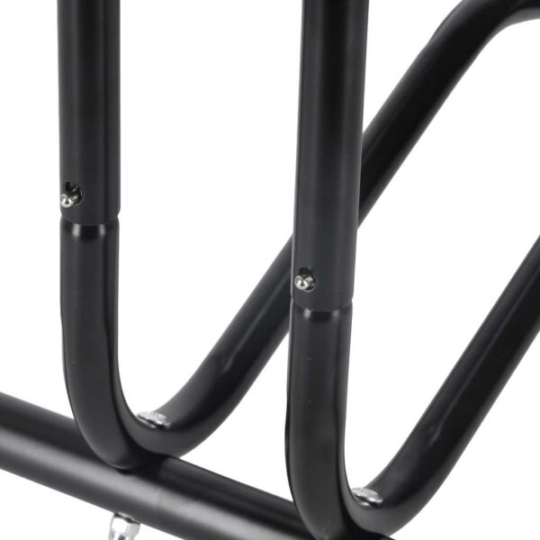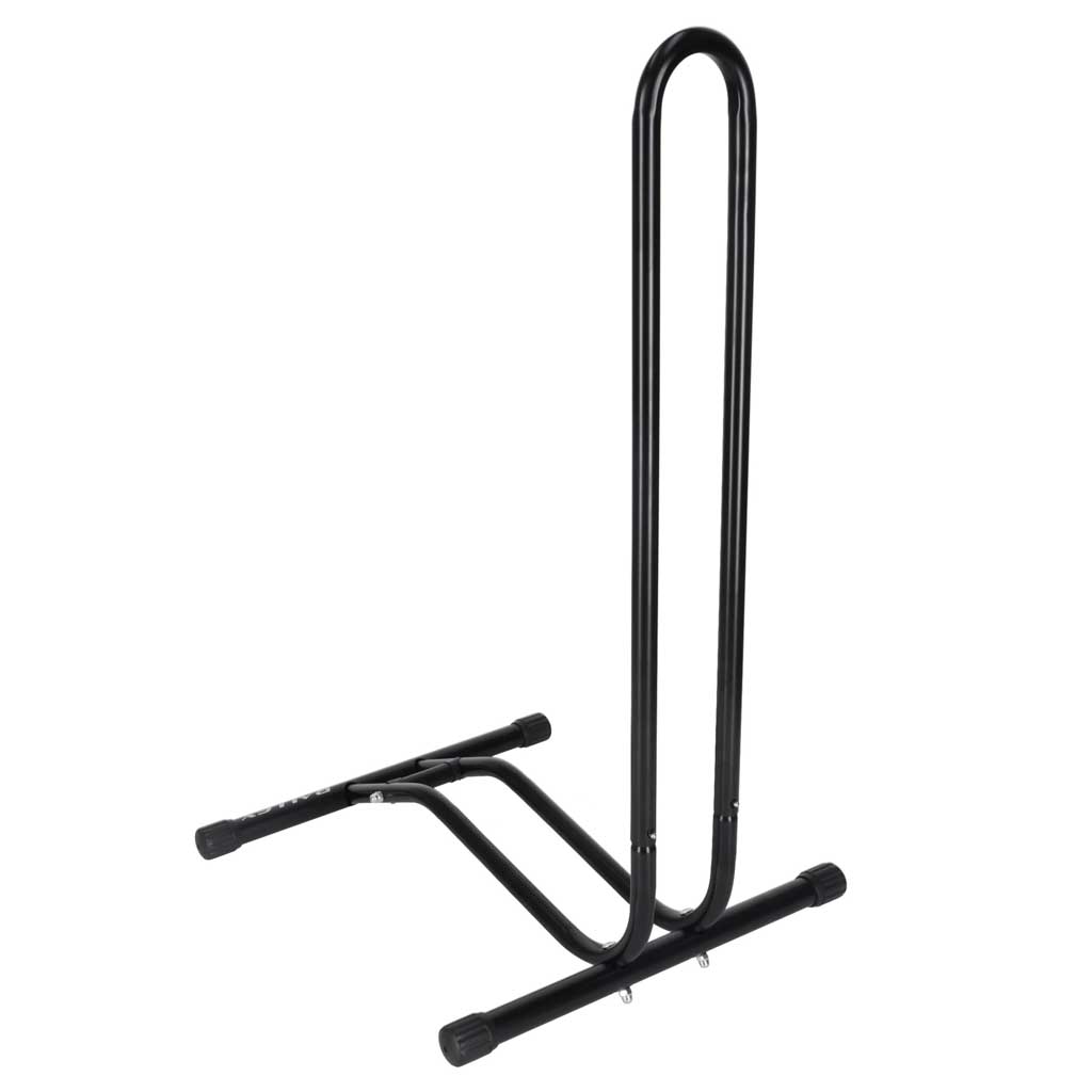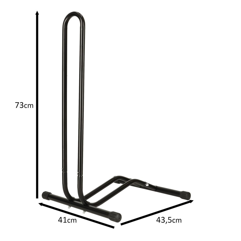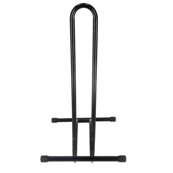 Stalowy stojak na rower umożliwiający stabilne postawienie roweru za przednie lub tylne koło. Przeznaczony do rowerów o maksymalnej szerokości opon 6,5 cm i średnicy 16-27,5″. Wymiary: 41 cm x 43,5 cm x 73 cm.