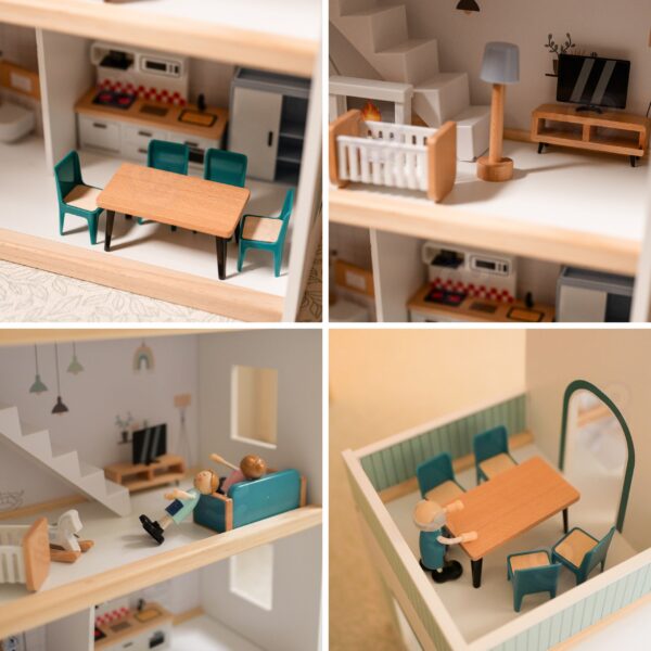 Domek dla lalek jest wyposażony w rodzinę sześciu lalek, które są gotowe do wprowadzenia się. Każda lalka ma unikalny styl i osobowość, a dzięki w pełni ruchomym stawom, możliwości kreatywnej zabawy są nieograniczone. W komplecie znajdują się także meble i dekoracje, które ożywiają każdy pokój, tworząc niepowtarzalną atmosferę.