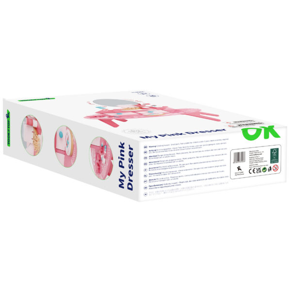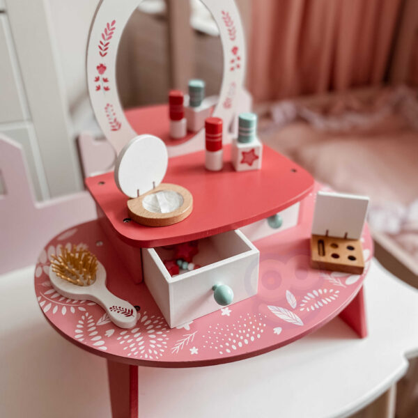 Piękna różowa toaletka od Tooky Toy to wymarzony mebel w pokoju każdej dziewczynki. Toaletka posiada dwie wysuwane szuflady, w które mała księżniczka może schować swoje skarby. Do zestawu dołączone są jeszcze liczne akcesoria. Całość wykonana z drewna i pomalowana nietoksycznymi farbami bezpiecznymi dla dzieci i środowiska.
