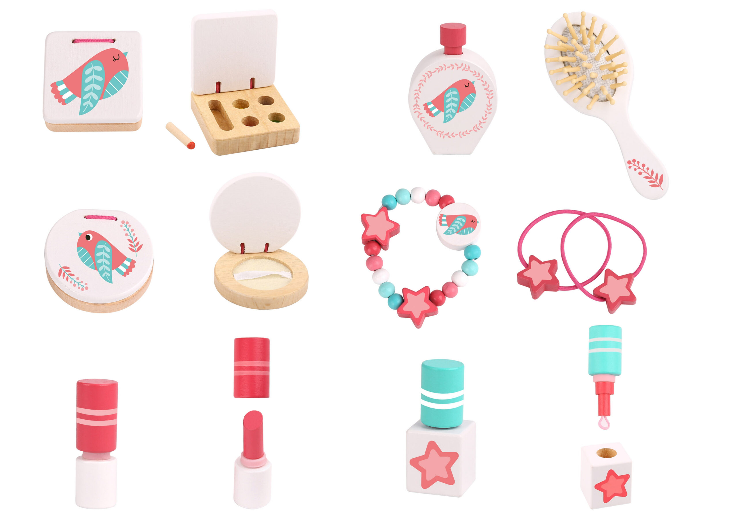- – zestaw zawiera drewniane akcesoria: lakier, szminkę, bransoletkę, kolczyki, szczotkę do czesania włosów, perfumy, puderniczkę i cienie do oczu,