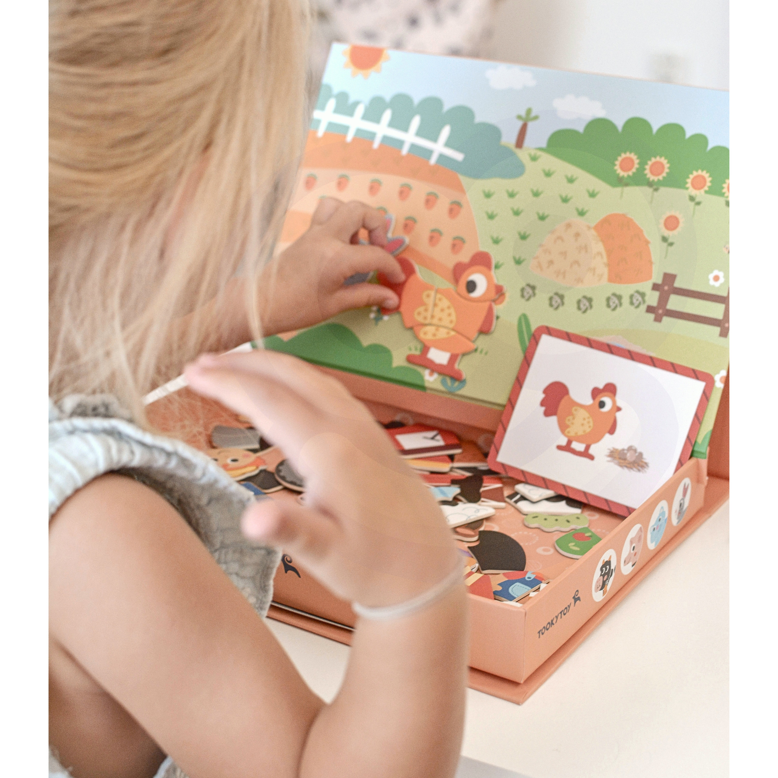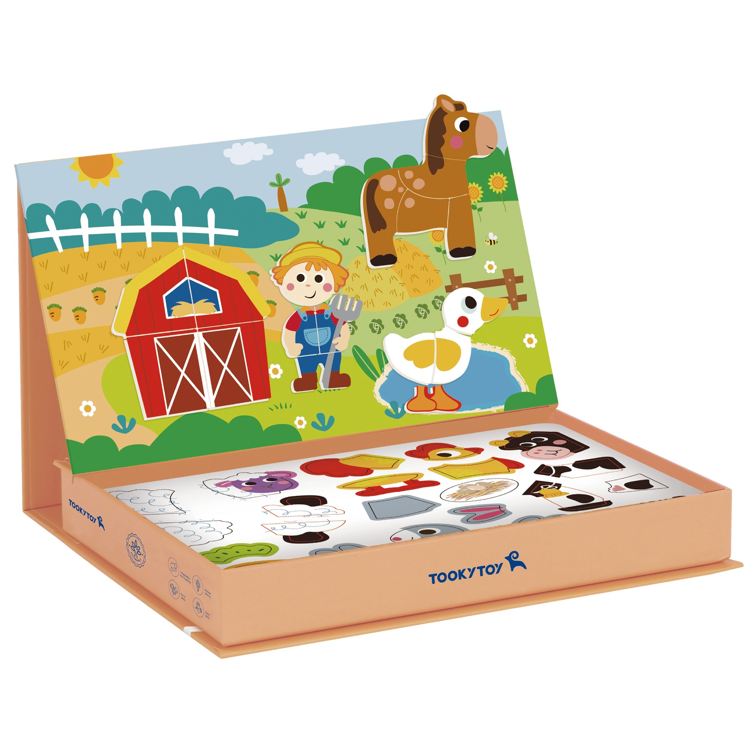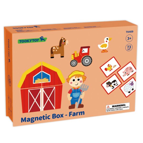 Magnetyczna Układanka Farma Puzzle marki Tooky Toy przenosi dzieci w świat wesołego gospodarstwa. Bogata grafika, mnóstwo magnetycznych elementów i możliwość tworzenia własnych scenek lub układać elementy zgodnie z dołączonymi 12 planszami. Magnetyczne puzzle gwarantują świetną zabawę i naukę przez kreatywność. Zabawa z układanką pomaga maluchom rozwijać motorykę, wyobraźnię i zdolności narracyjne. Dzięki praktycznemu zamykanemu pudełku zestaw sprawdzi się zarówno w domu, jak i w podróży.
