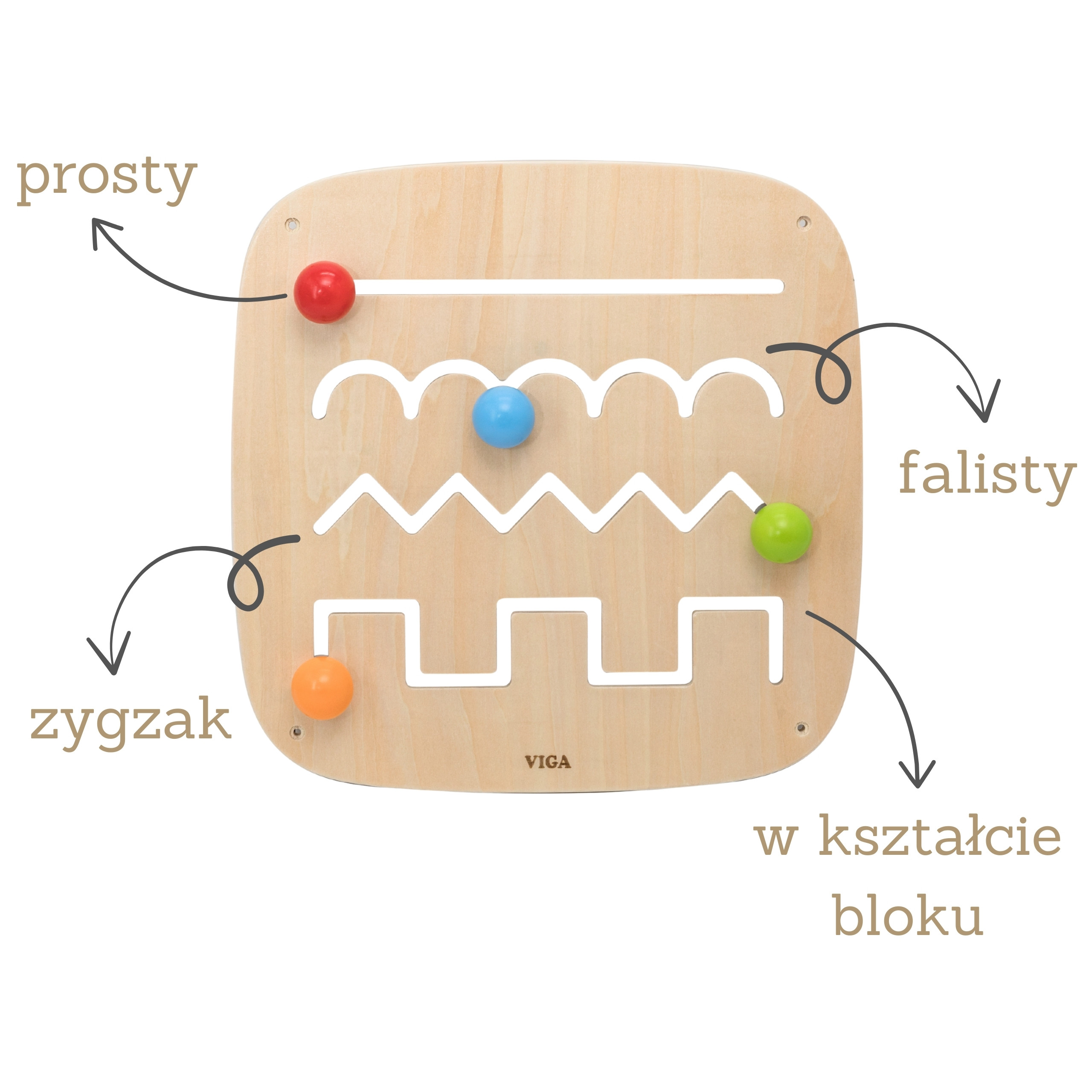 Ta drewniana tablica manipulacyjna to idealne narzędzie do nauki poprzez zabawę, stworzone z myślą o małych dzieciach od 12 miesiąca życia. Produkt pomaga w rozwoju koordynacji ręka-oko i motoryki małej, wprowadzając maluchy w świat różnorodnych linii i kształtów w interaktywny sposób. Tablica posiada cztery przesuwane tory z różnymi wzorami – prostym, falistym, zygzakowatym oraz w kształcie bloku. Do każdego toru przymocowana jest kolorowa kulka z łatwym do uchwycenia uchwytem, zaprojektowanym z myślą o małych rączkach. Przesuwając kulki, dzieci odkrywają różne cechy linii, ćwiczą rozpoznawanie kolorów oraz uczą się pojęć, takich jak kąty i krzywe. Tablica jest łatwa w montażu na ścianie, a jej solidna, drewniana konstrukcja zapewnia trwałość i bezpieczeństwo podczas zabawy.