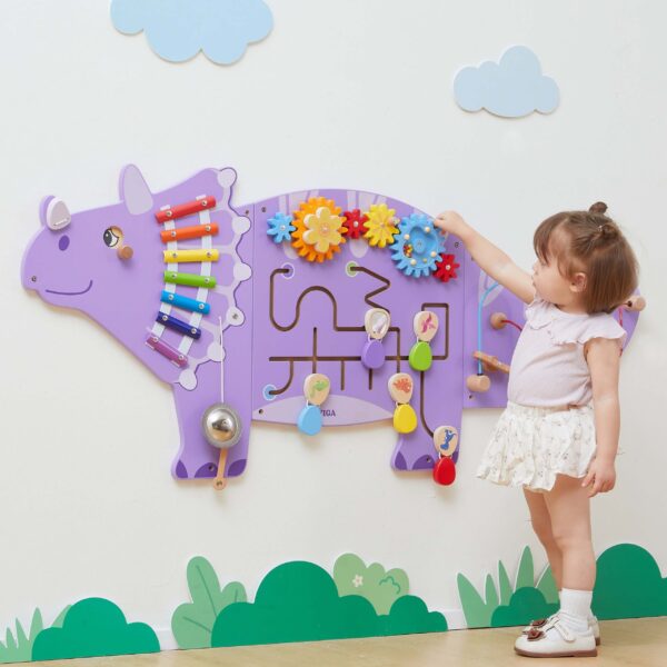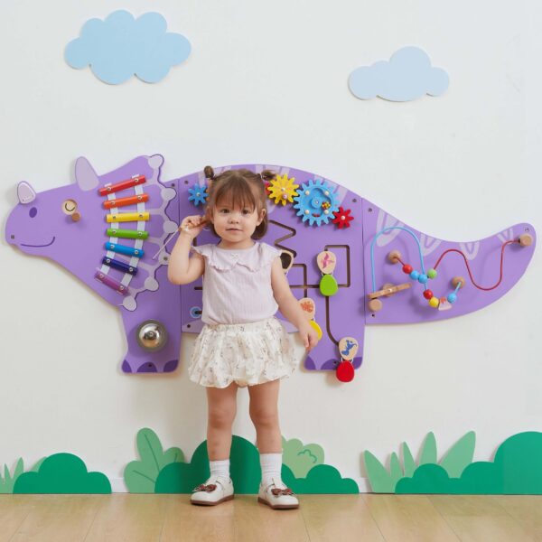 Ta fascynująca tablica sensoryczna w kształcie dinozaura Triceratopsa od marki Viga Toys, przenosi codzienną zabawę na wyższy poziom edukacji! Dzieci mogą bawić się kołami zębatymi, labiryntami z obracanymi jajeczkami i pętlami z koralikami — wszystko w jednym wielofunkcyjnym panelu. Tablica jest idealna do domu, przedszkola lub sali zabaw, zachęca do eksperymentowania i samodzielnej nauki poprzez kreatywną zabawę. Solidne, lakierowane drewno oraz nietoksyczne farby zapewniają trwałość i bezpieczeństwo nawet przy długotrwałym użytkowaniu.