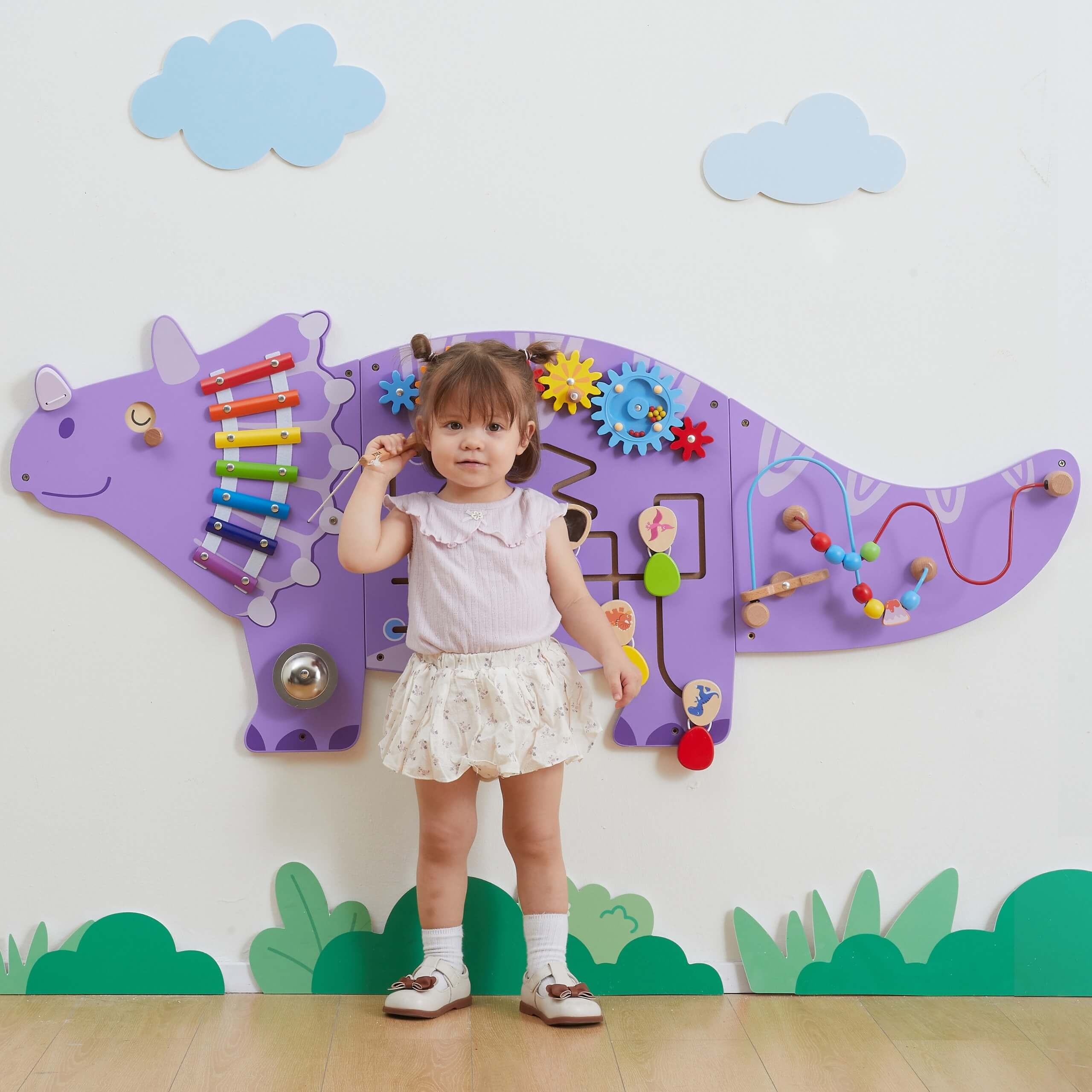 - – Multifunkcyjne elementy: koła zębate, labirynt z otwieranymi jajeczkami, pętle motoryczne oraz muzyczne aktywności