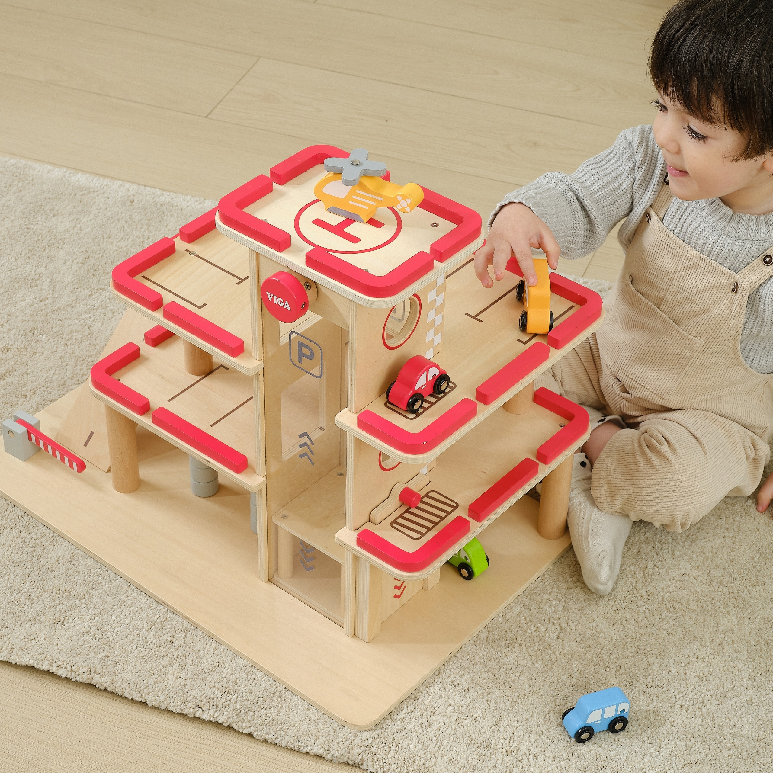 VIGA Drewniany Parking dla Samochodzików z Windą 4 Autka Helikopter