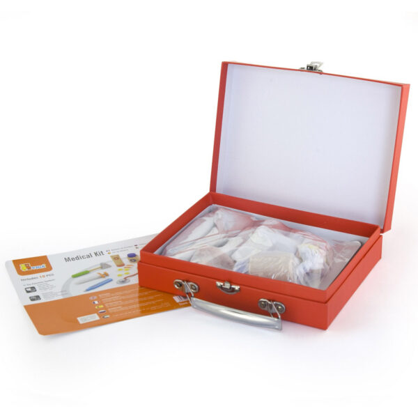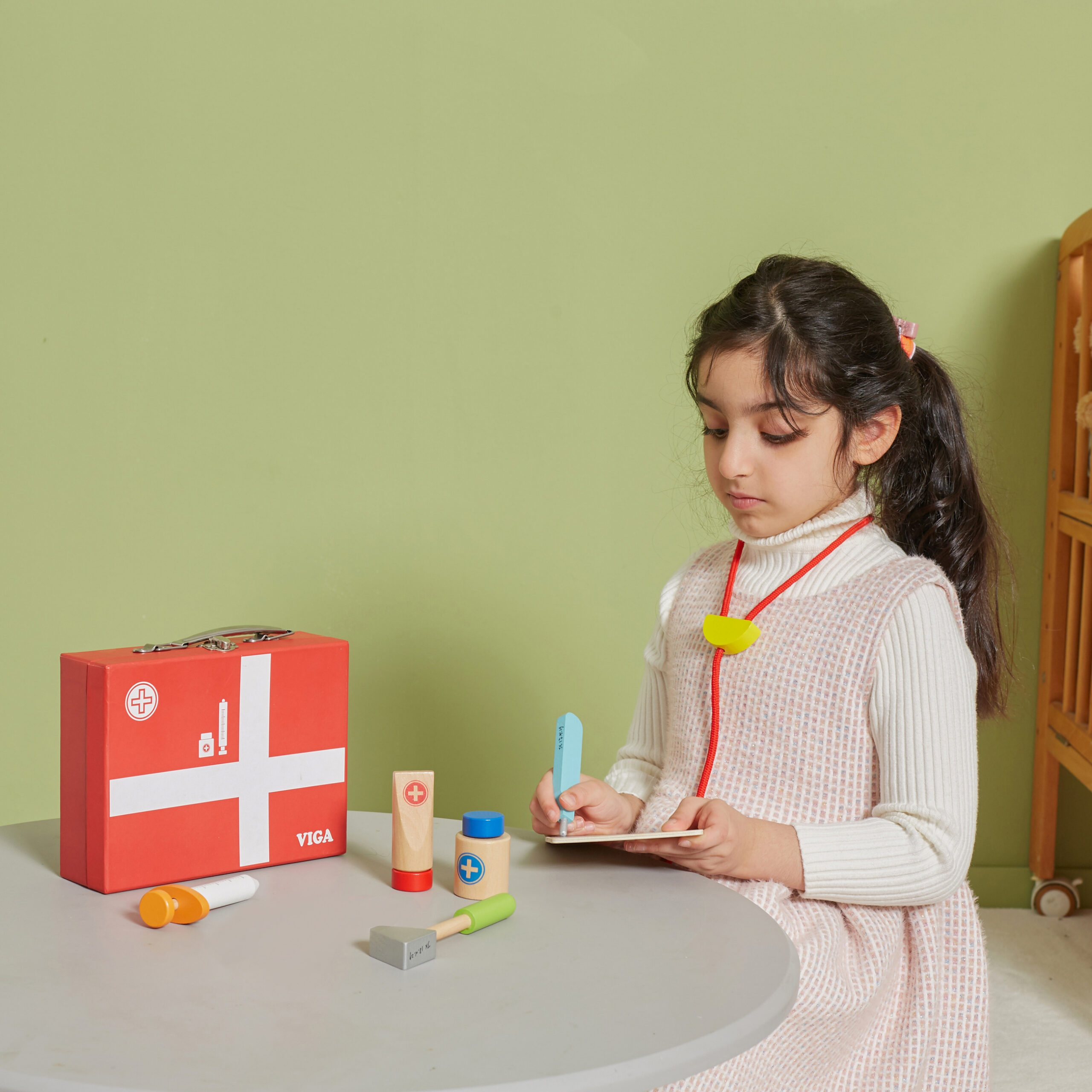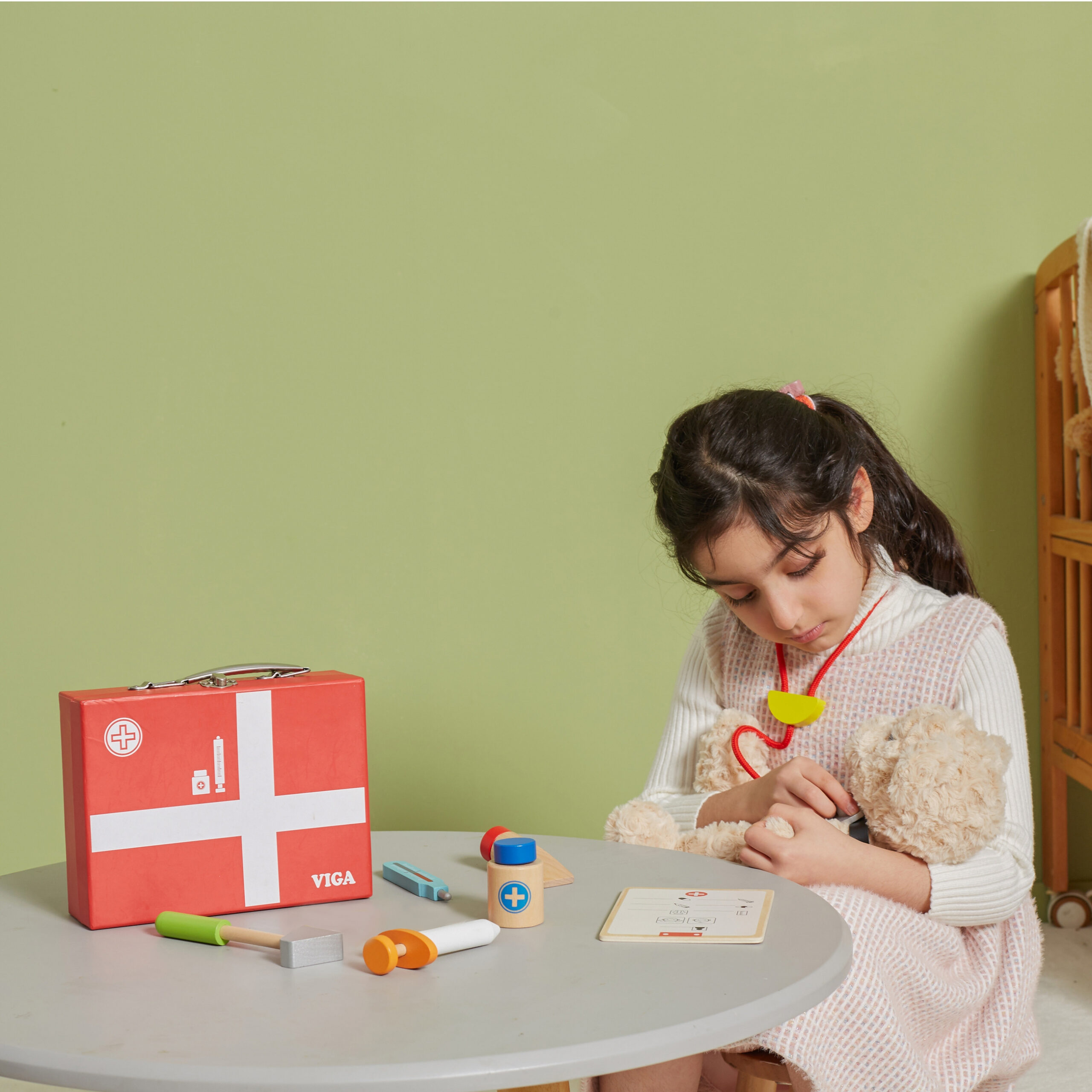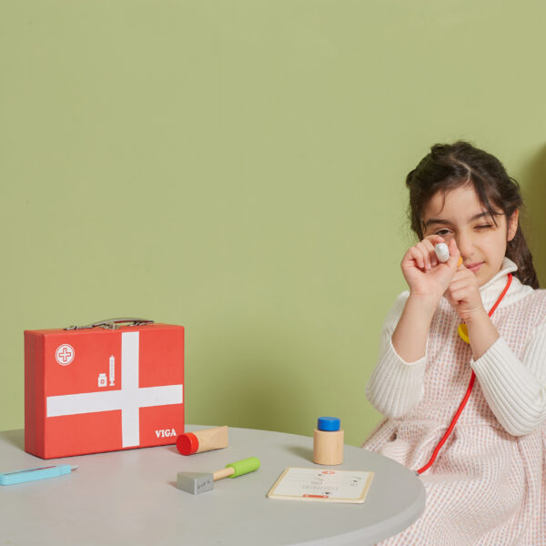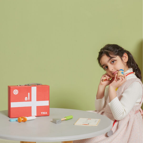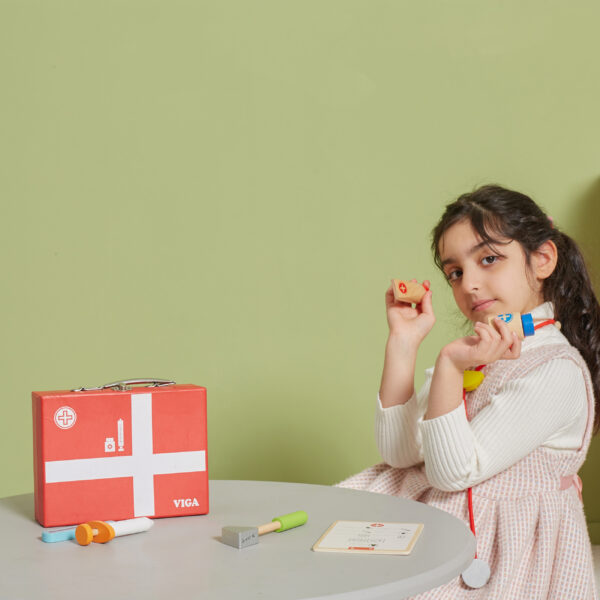 Zestaw Viga zawiera wszystko, czego potrzebuje Twój mały Lekarz do zabawy w doktora. Przyszli lekarze, lekarki, pielęgniarze i pielęgniarki mogą słuchać bicia serca pacjentów (misiów, lalek) za pomocą stetoskopu, „mierzyć” im temperaturę termometrem, „robić” zastrzyki czy wypisać kartę pacjenta. Zabawa w Doktora to nie tylko jedna z zabaw na odgrywanie ról, to również nauka empatii i współodczuwania, co jest bardzo ważne w relacjach społecznych. Wspiera rozwój wyobraźni i uczy rozwiązywania problemów. Zestaw pomoże przezwyciężyć strach przed lekarzem.