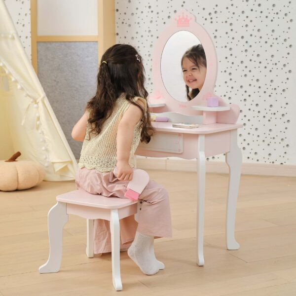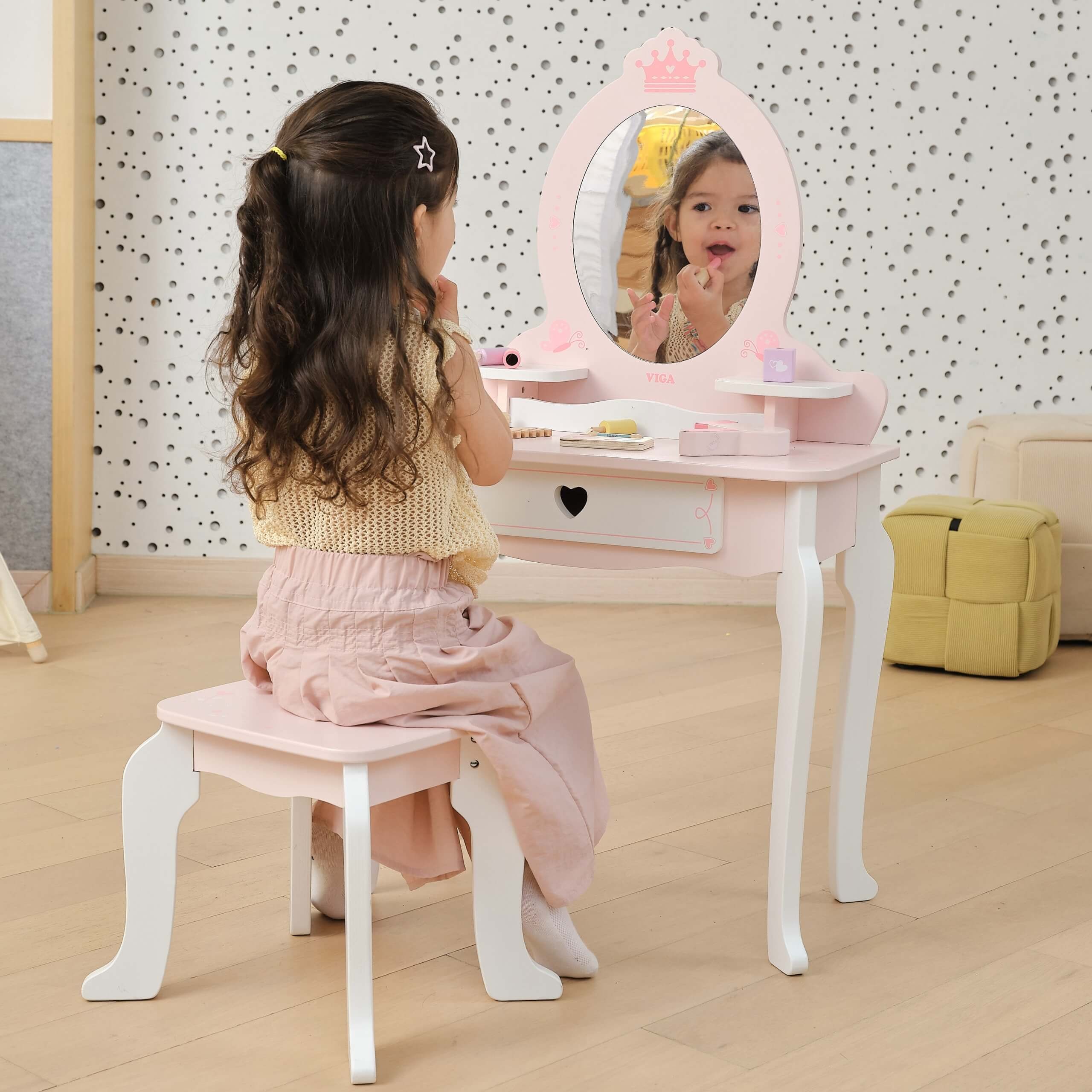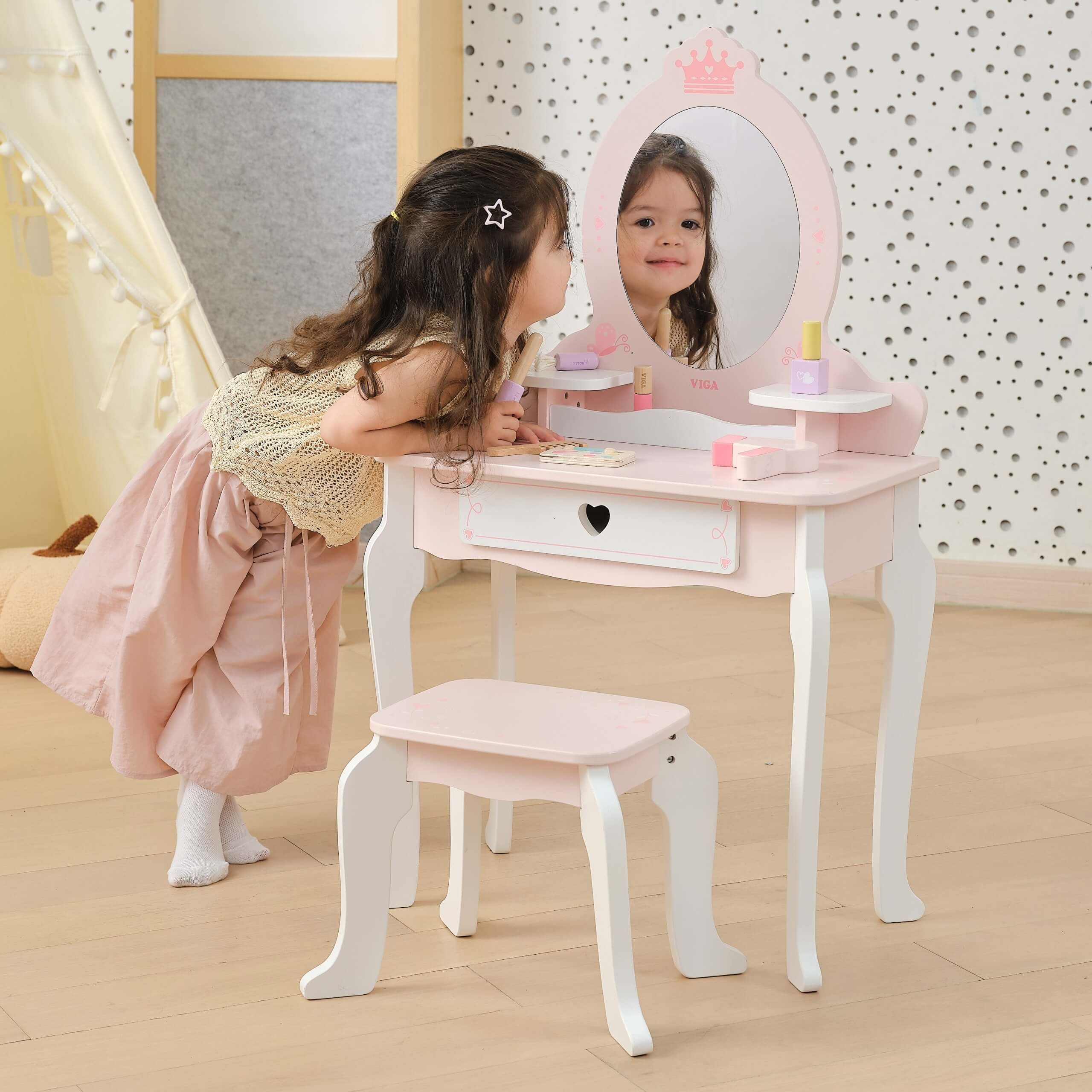 VIGA Duża Toaletka Drewniana Biało-Różowa z Lustrem i Krzesełkiem