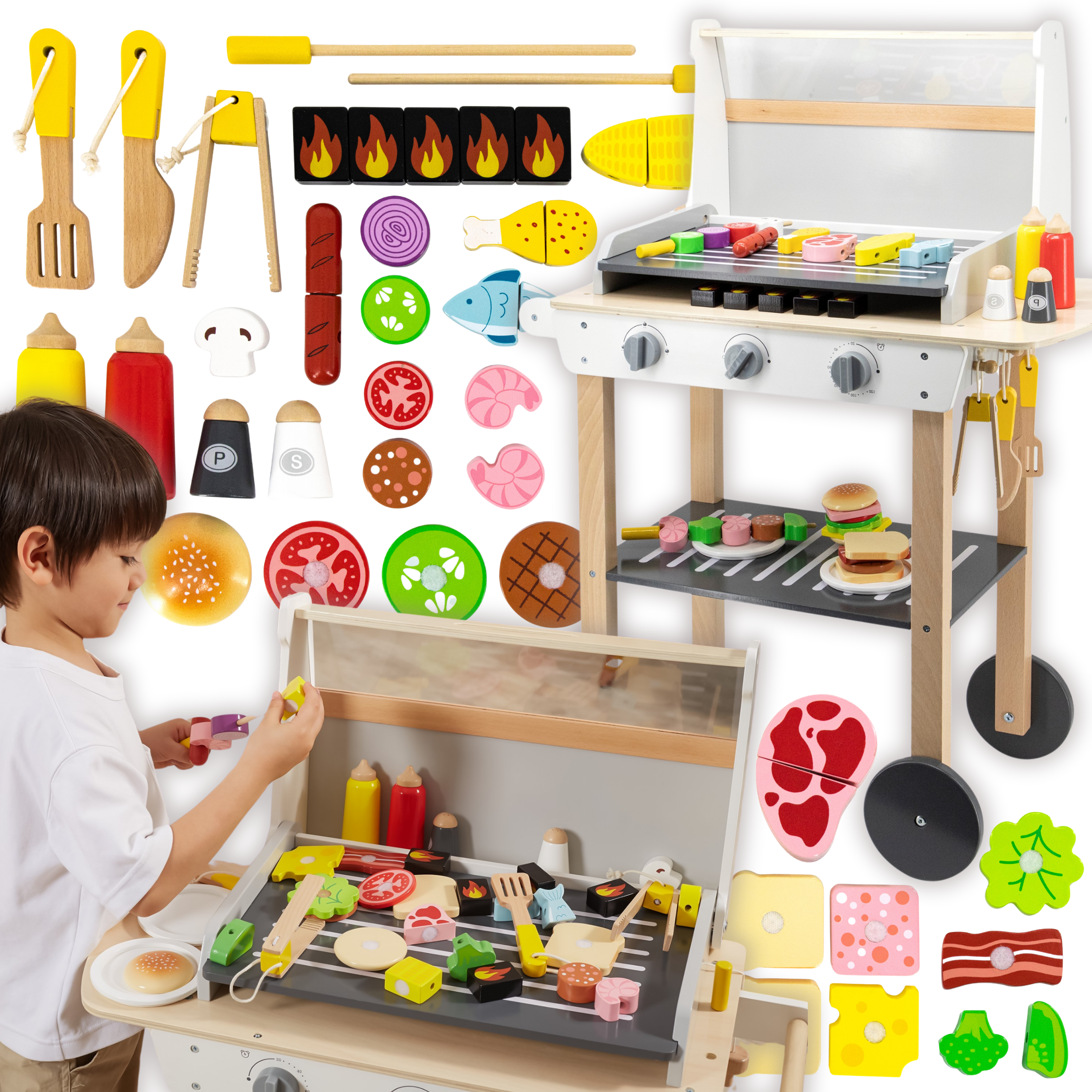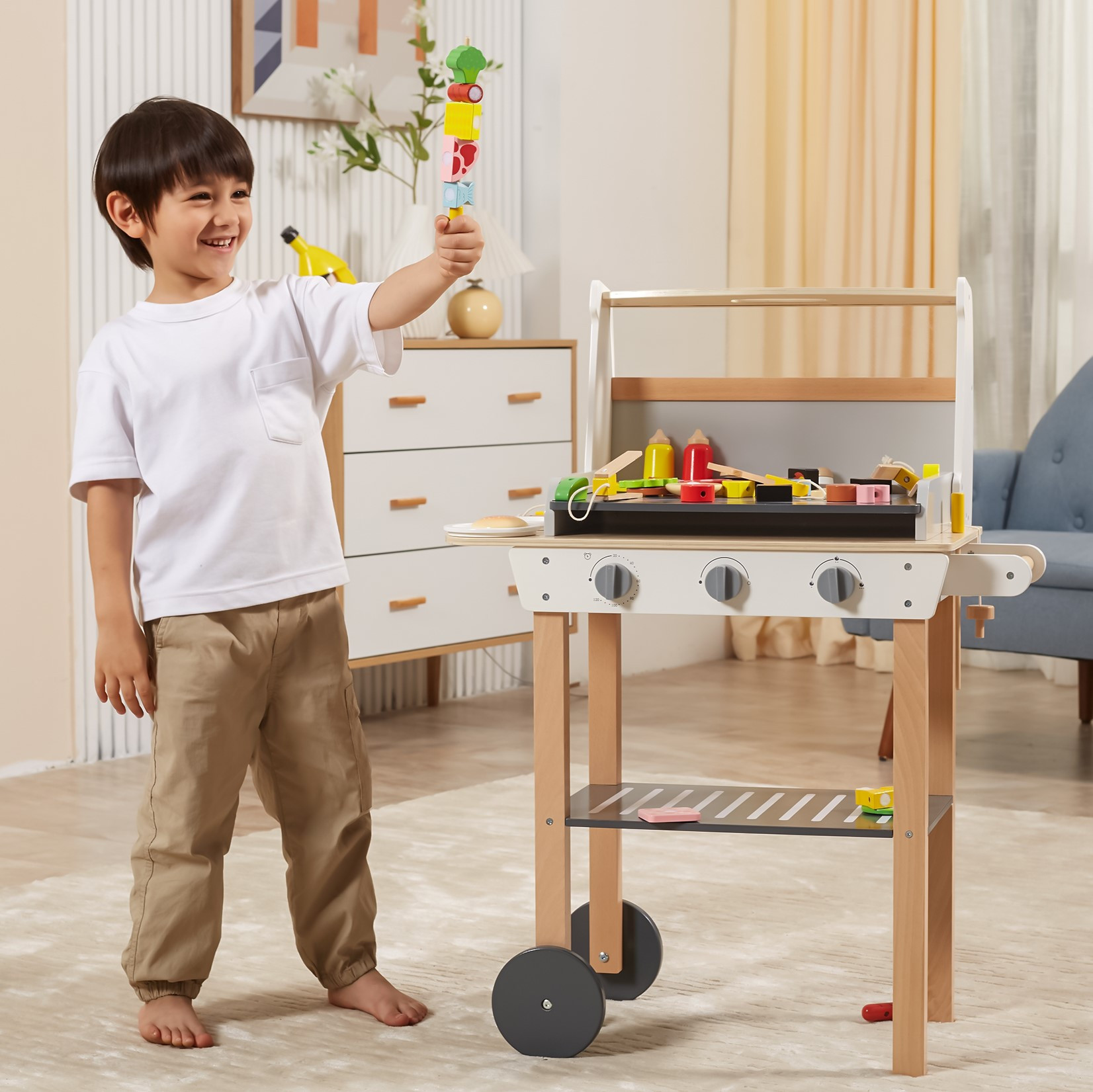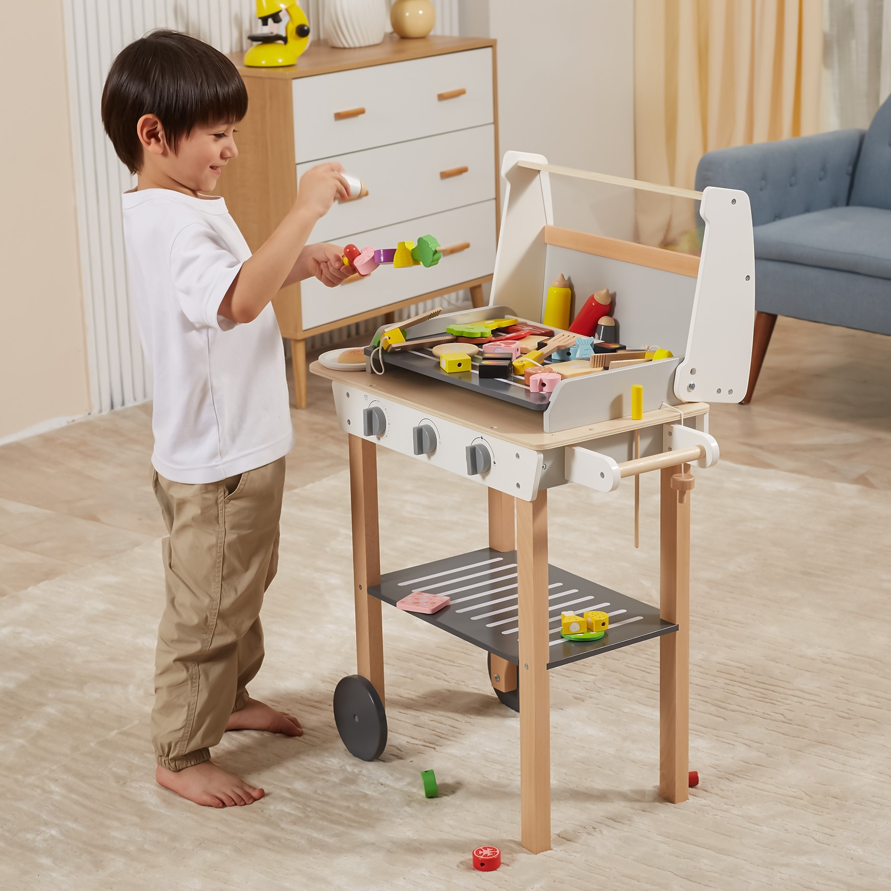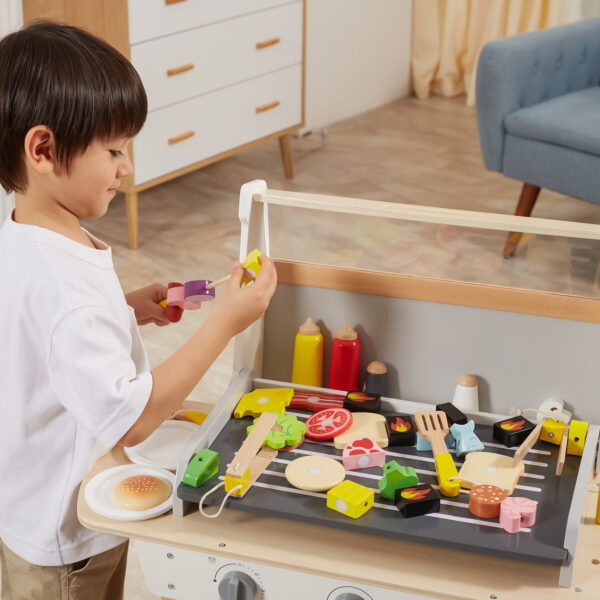 Drewniany Grill Barbecue od marki VIGA jest jak prawdziwy grill! Zestaw zawiera 47 akcesoriów, takich jak słoiki z przyprawami, keczup, musztardę, szczypce, sztućce itp. Realistyczności dodają efekty dźwiękowe. Dzieci mogą tworzyć szaszłyki, kanapki, burgery. Zdejmowana pokrywa pozwala zabezpieczyć „gorący” ruszt po grillowaniu, a kółeczka i wygodny uchwyt pozwalają przewozić grill w dowolne miejsce ogrodu lub domu. Dziecko będzie mogło wcielić się w rolę dorosłego, który pilnuje rodzinnego grilla.