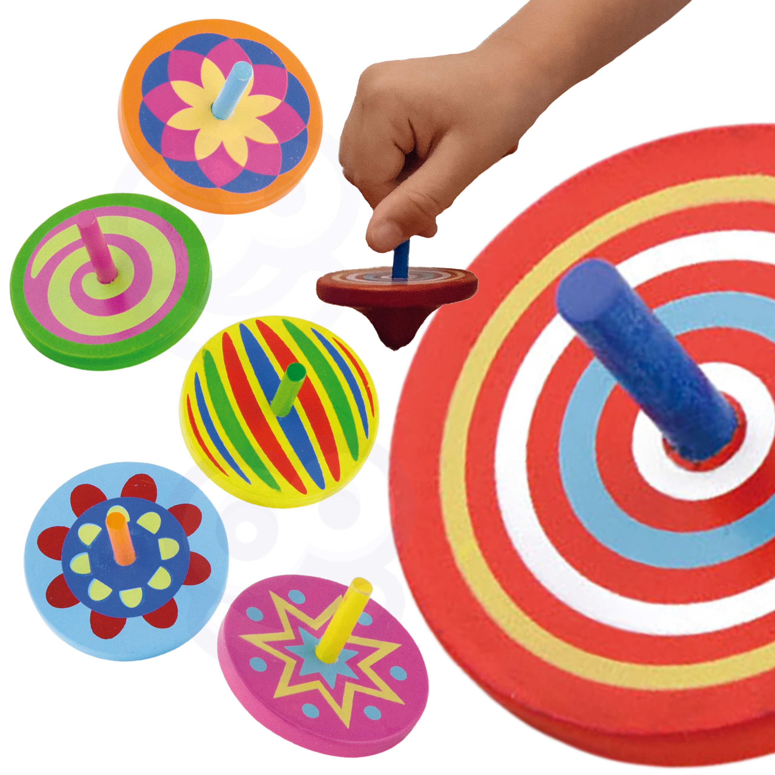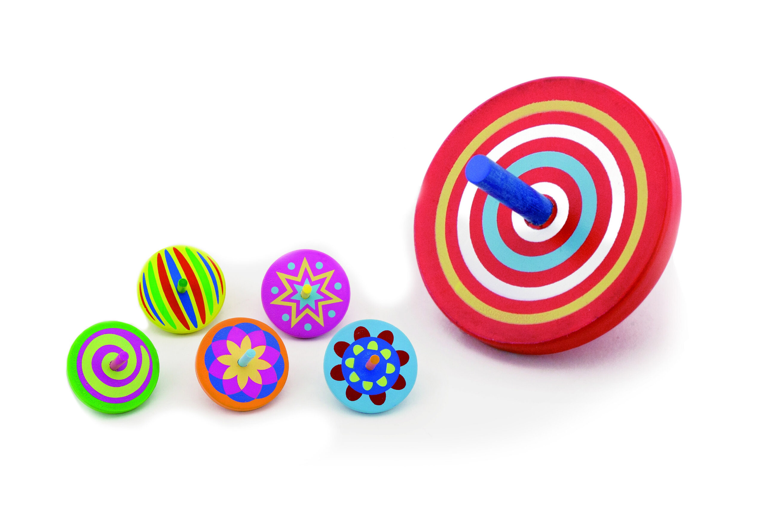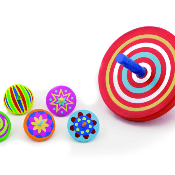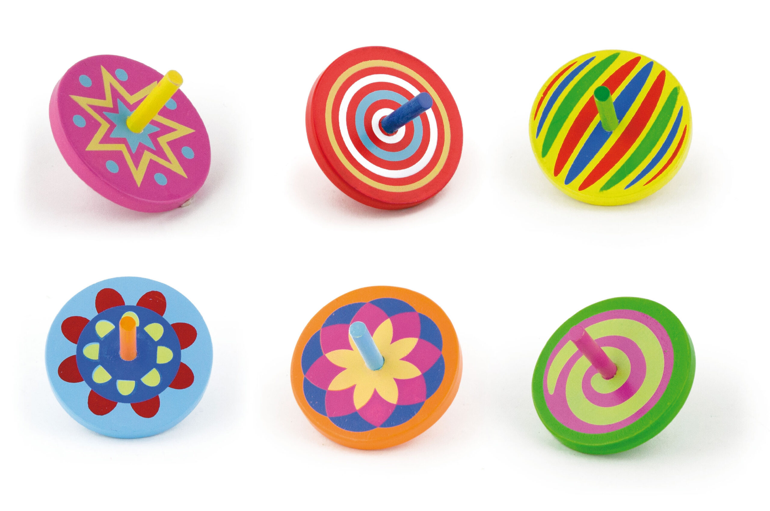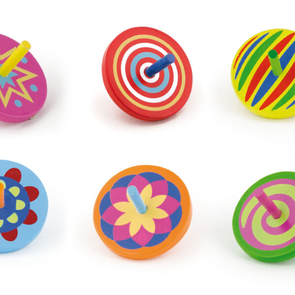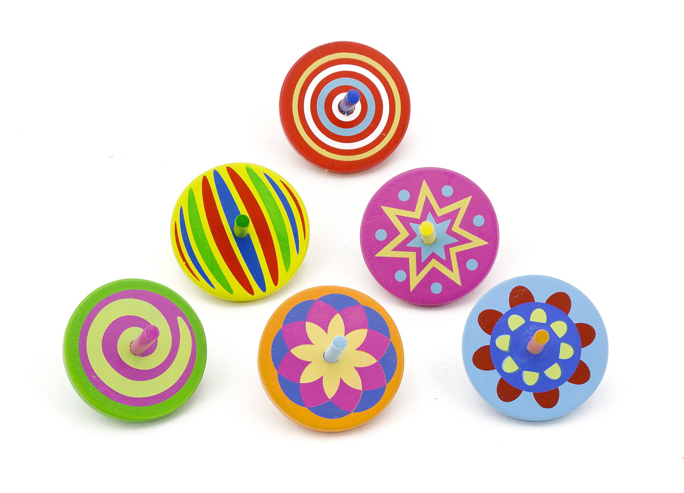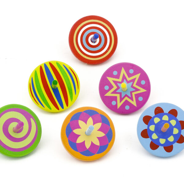 Kolorowe drewniane bączki zachwycą dziecko podczas zabawy. Podczas kręcenia się bączki tworzą ciekawe wzory, które spodobają się dzieciom.