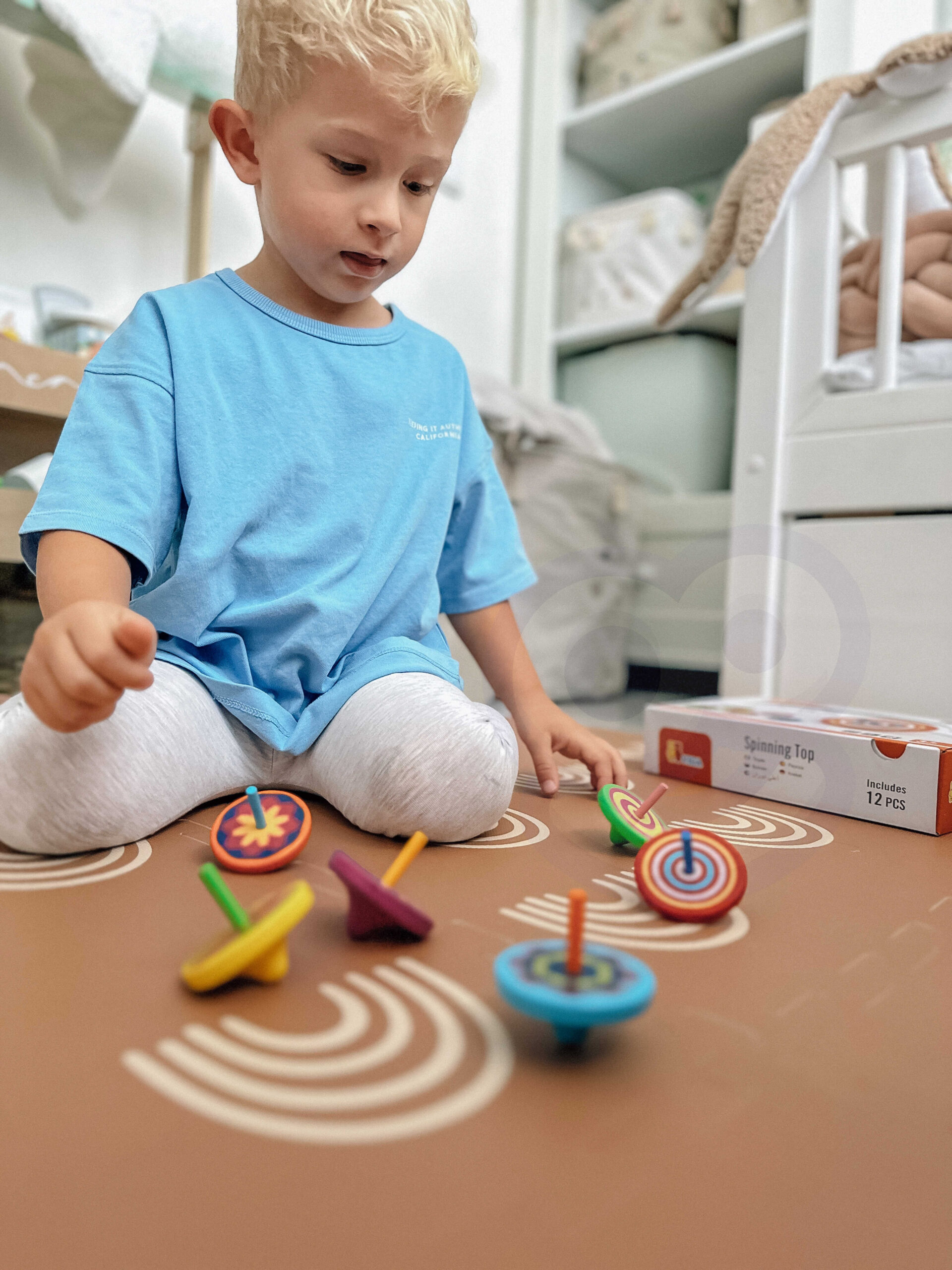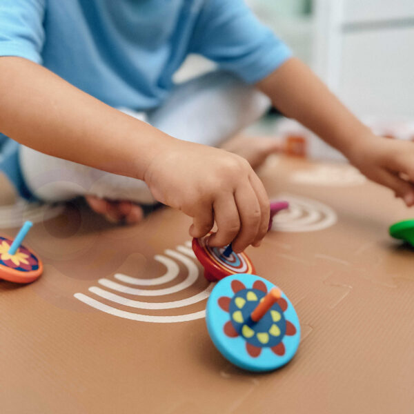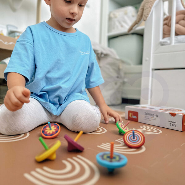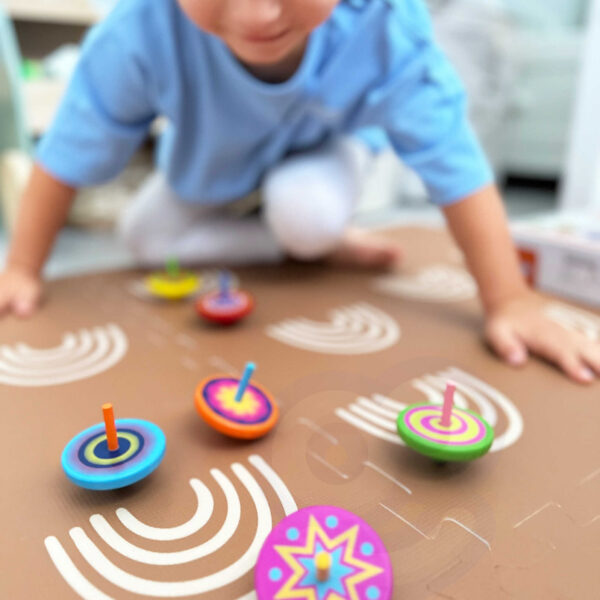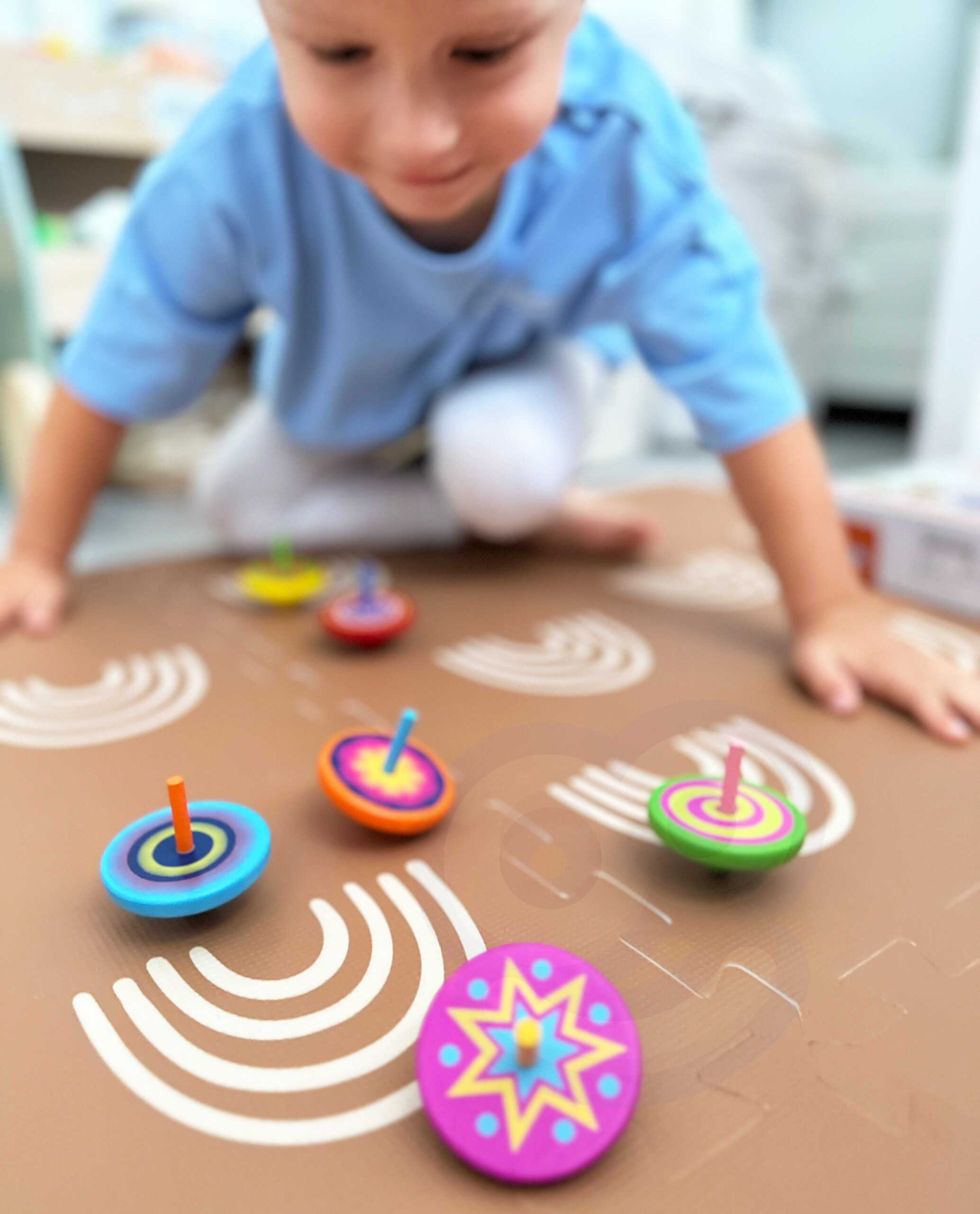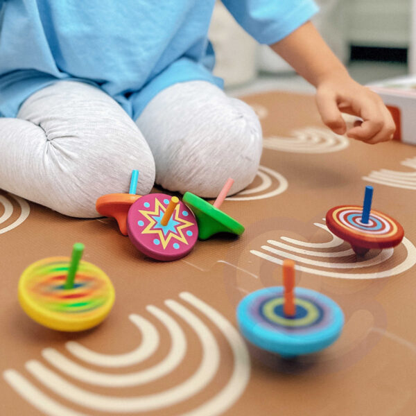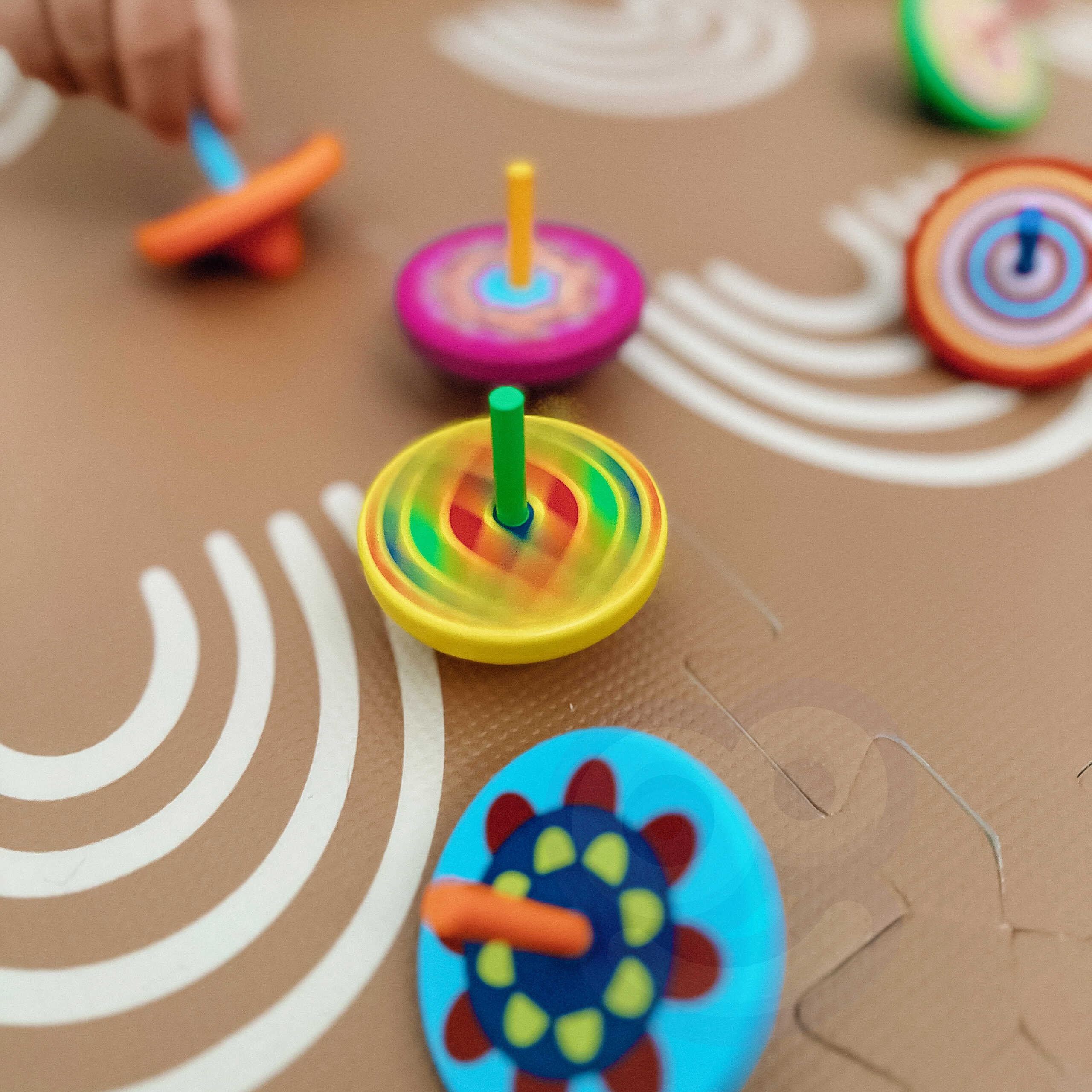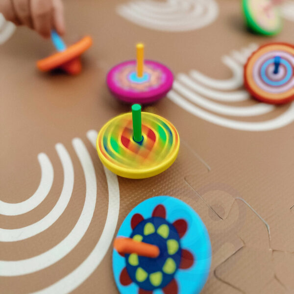 Kolorowe drewniane bączki zachwycą dziecko podczas zabawy. Podczas kręcenia się bączki tworzą ciekawe wzory, które spodobają się dzieciom.