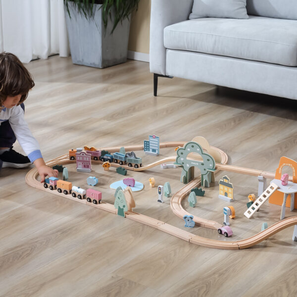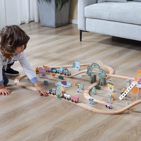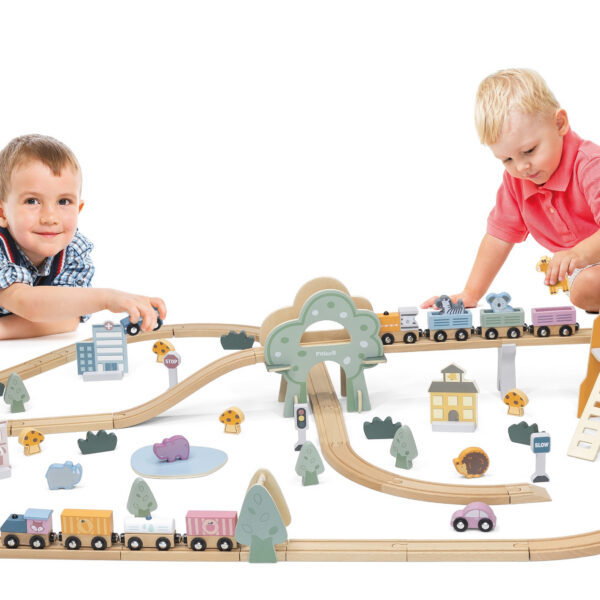 - – W skład wchodzą tory, podjazdy, pociąg z wagonikami, znaki, budynki, zwierzątka, pojazdy oraz elementy krajobrazu.
