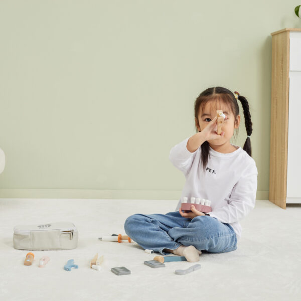 Ten wyjątkowy zestaw małego dentysty od marki Viga, to idealna zabawka, która łączy zabawę z nauką o zdrowiu i opieką! Dziecko może przebierać się za stomatologa i badać „pacjentów” z uśmiechem, co pomaga przełamać lęk przed prawdziwymi wizytami u dentysty. Zestaw wykonany jest z solidnego drewna i pomalowany bezpiecznymi, nietoksycznymi farbami. Poręczna torba sprawia, że wszystkie narzędzia są zawsze pod ręką — świetna do zabawy w domu, u dziadków czy w przedszkolu. To nie tylko zabawka — to pierwszy krok w rozwijaniu pewności siebie, kreatywności i empatii u dziecka!