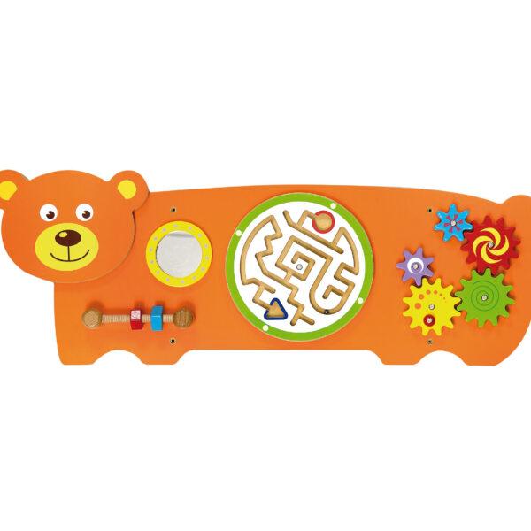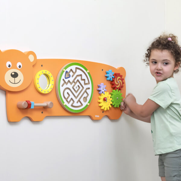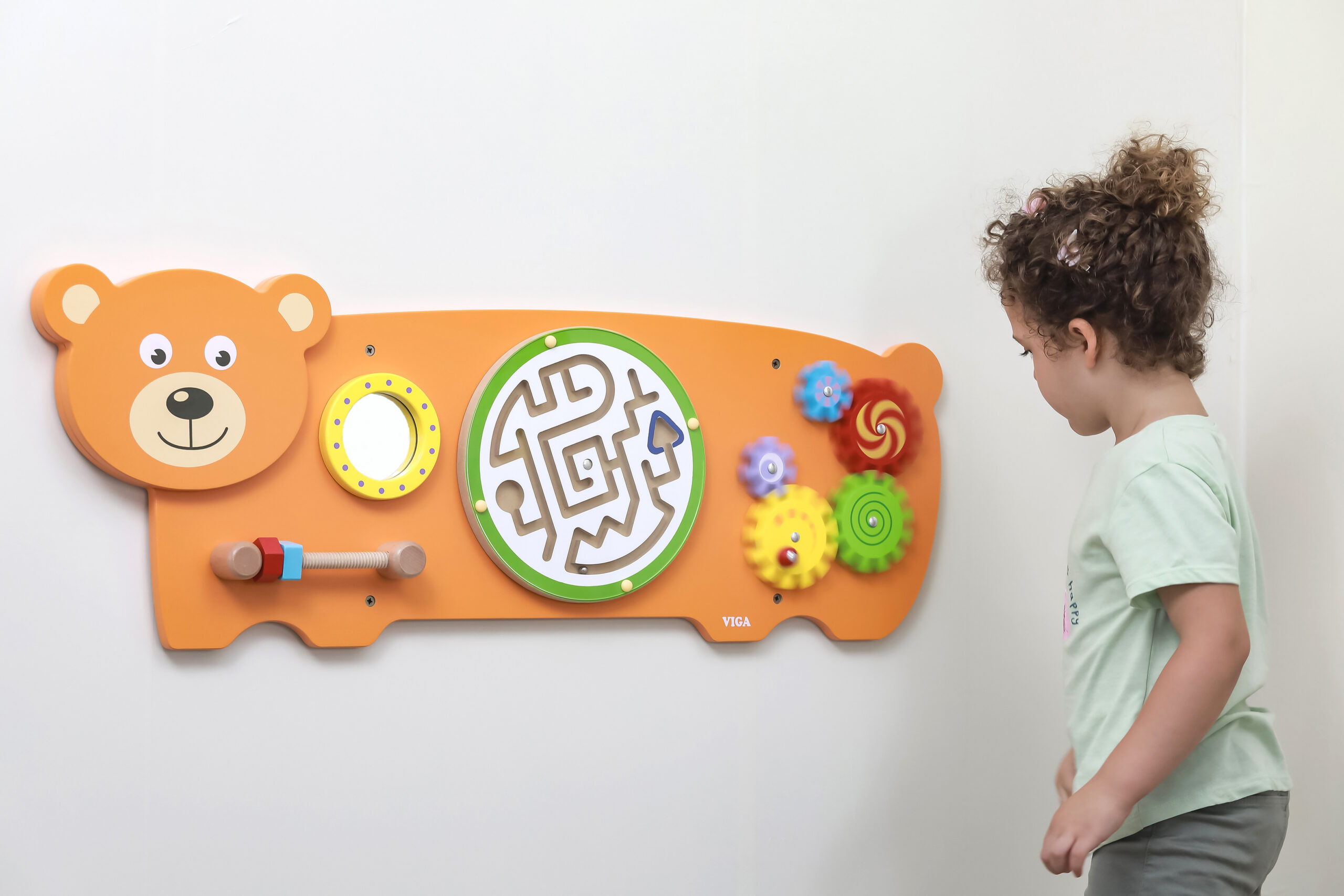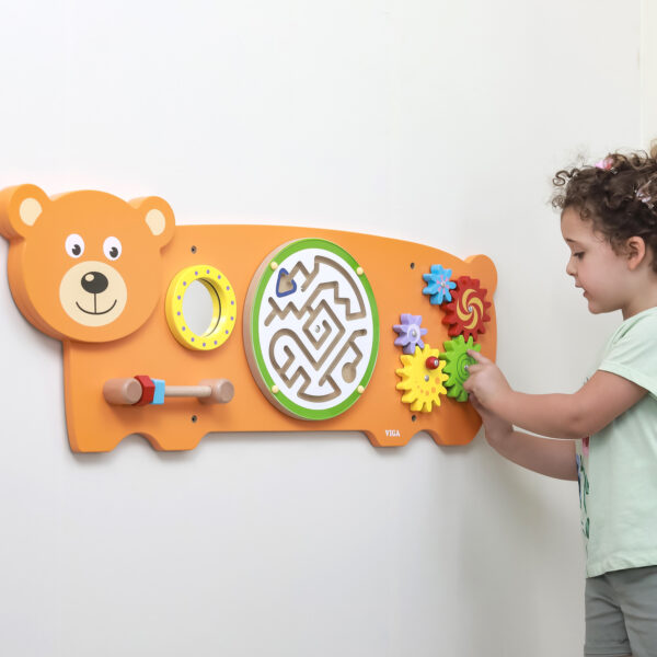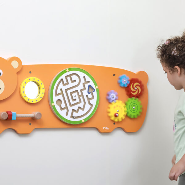 Ta duża, kolorowa tablica w kształcie sympatycznego misia od marki Viga, łączy w sobie zabawę i naukę, rozwija sprawność rączek, koordynację wzrokowo-ruchową i ciekawość odkrywania. Takie elementy jak śrubki, labirynt, koła zębate i lusterko to mini wyzwania, które angażują dziecko na dłużej i daje mnóstwo frajdy! Produkt wykonany z wysokiej jakości drewna, bezpiecznie pomalowany i zgodny z normami CE i EN 71. Świetny sposób, by zamienić codzienną zabawę w rozwój umiejętności i zaproś małego odkrywcę do świata kreatywnej zabawy już dziś.