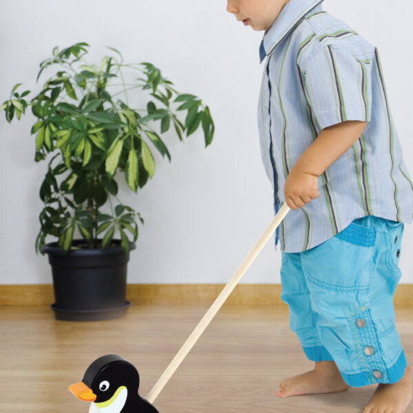 Pchacz z Pingwinem na kijku od firmy Viga jest przeznaczony dla dzieci, które właśnie uczą się stawiać pierwsze kroki. Kolorowy pchacz zachęci maluszka do stawiania pierwszych kroków, będzie wdzięcznym towarzyszem spacerów w domu, ogrodzie oraz parku.