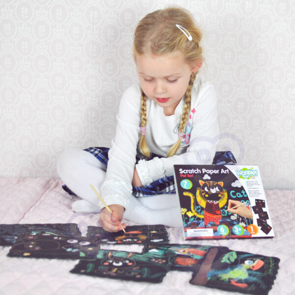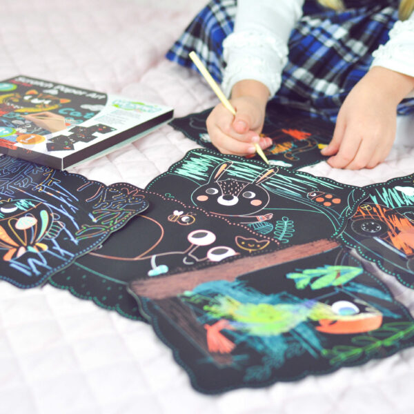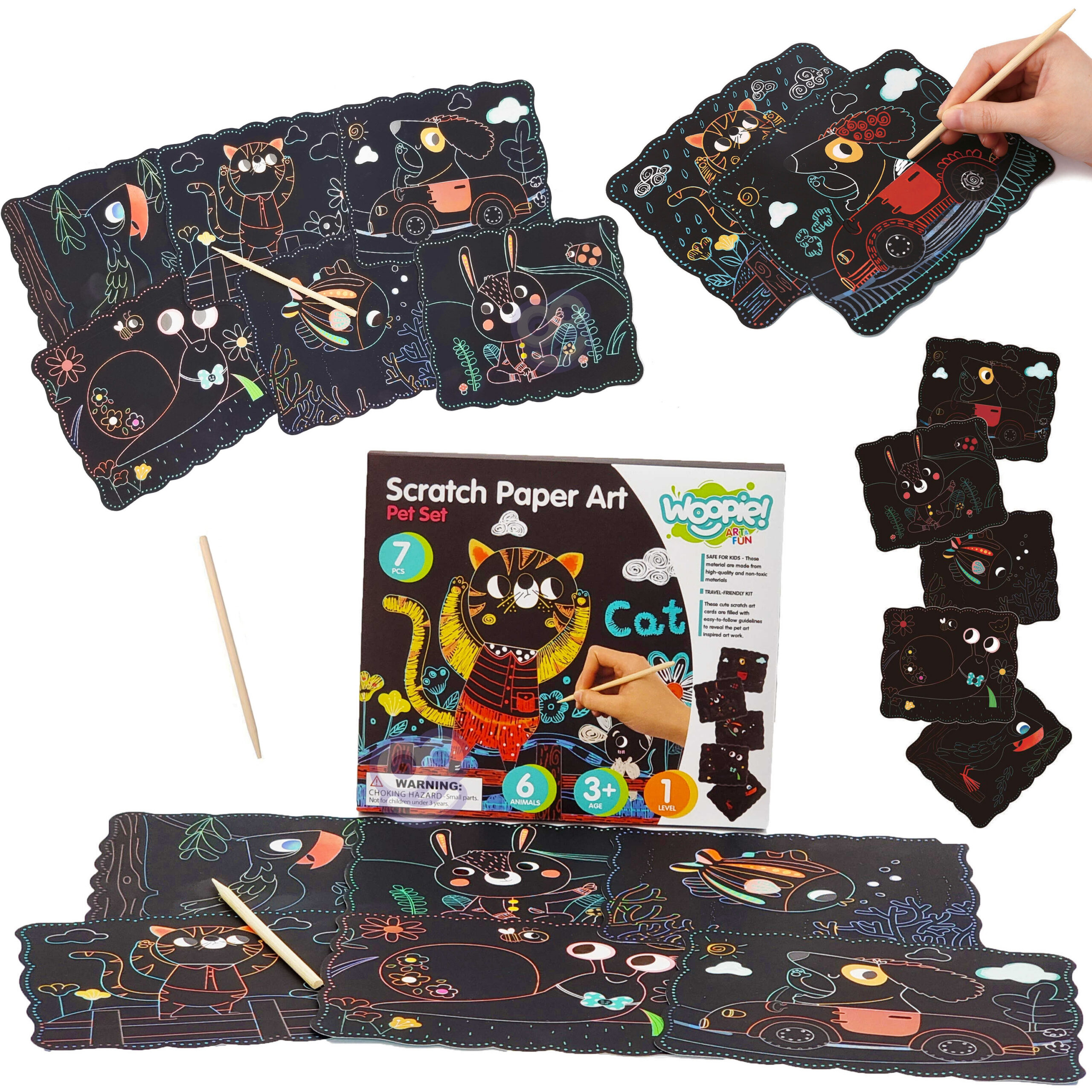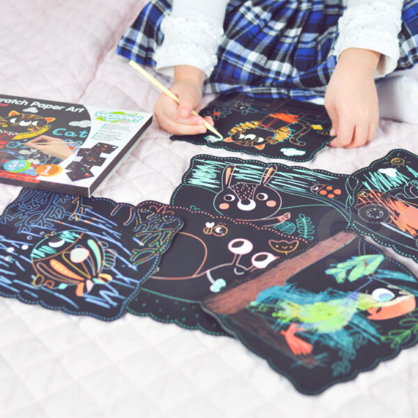 Rozbudź wyobraźnie dziecka magicznymi wydrapywankami od marki WOOPIE z serii ART&FUN! Za pomocą drewnianego rysika dziecko może wydrapywać, nowe formy/wzory zakryte na planszy i następnie obserwować jak kolory tworzą niezwykły, spójny obraz z motywem zwierząt! Zestaw zawiera 7 elementów, w tym 6 planszy do wydrapania oraz rysik. Plansze zawierają obrazy z kotem, psem, ślimakiem, królikiem, rybką oraz papugą. Dziecko można zabrać zestaw wszędzie dzięki wygodnemu opakowaniu z zamknięciem. Zabawka rozwija zdolności motoryczne dziecka oraz rozbudza kreatywność i wyobraźnie!