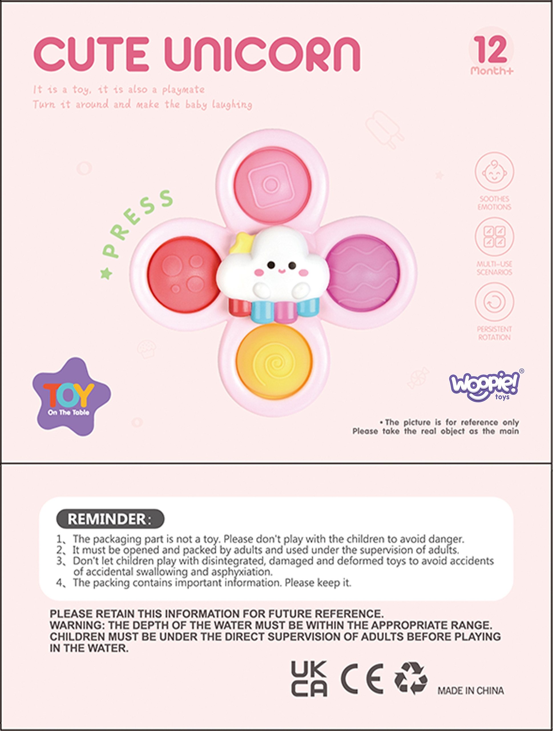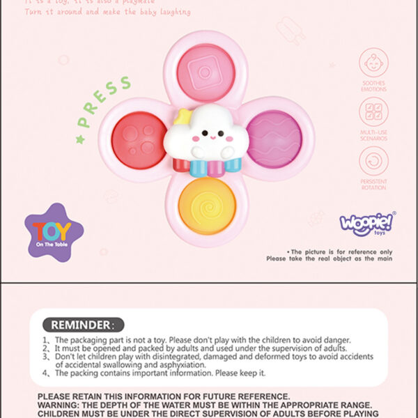 Zestaw Uroczych Spinnerów od marki WOOPIE zrobi na dziecku duże wrażenie. W zestawie znajdują się 3 szt. spinnerów: Jednorożec Gwiazdka Chmurka. Spinnery dziecko może zabrać i przyczepić wszędzie dzięki gumowym przyssawkom. Można przyczepić spinnera zarówno do szyby w czasie podróży oraz do wanny podczas kąpieli (zabawkę można moczyć). Łożyska spinnerów gwarantują długotrwały obrót. Odczepiane elementy pozwalają na łączenie ich w dowolny sposób. Zabawki posiadają gumowe elementy o różnej powierzchni co rozwinie zmysły dziecka oraz zadziała odstresowująco. Zabawa ćwiczy zwinność rączek oraz poprawia koordynację ręka-oko. Te zabawki mogą działać jako narzędzie do relaksacji i redukcji stresu, pomagając w osiągnięciu stanu spokoju i wyciszenia.