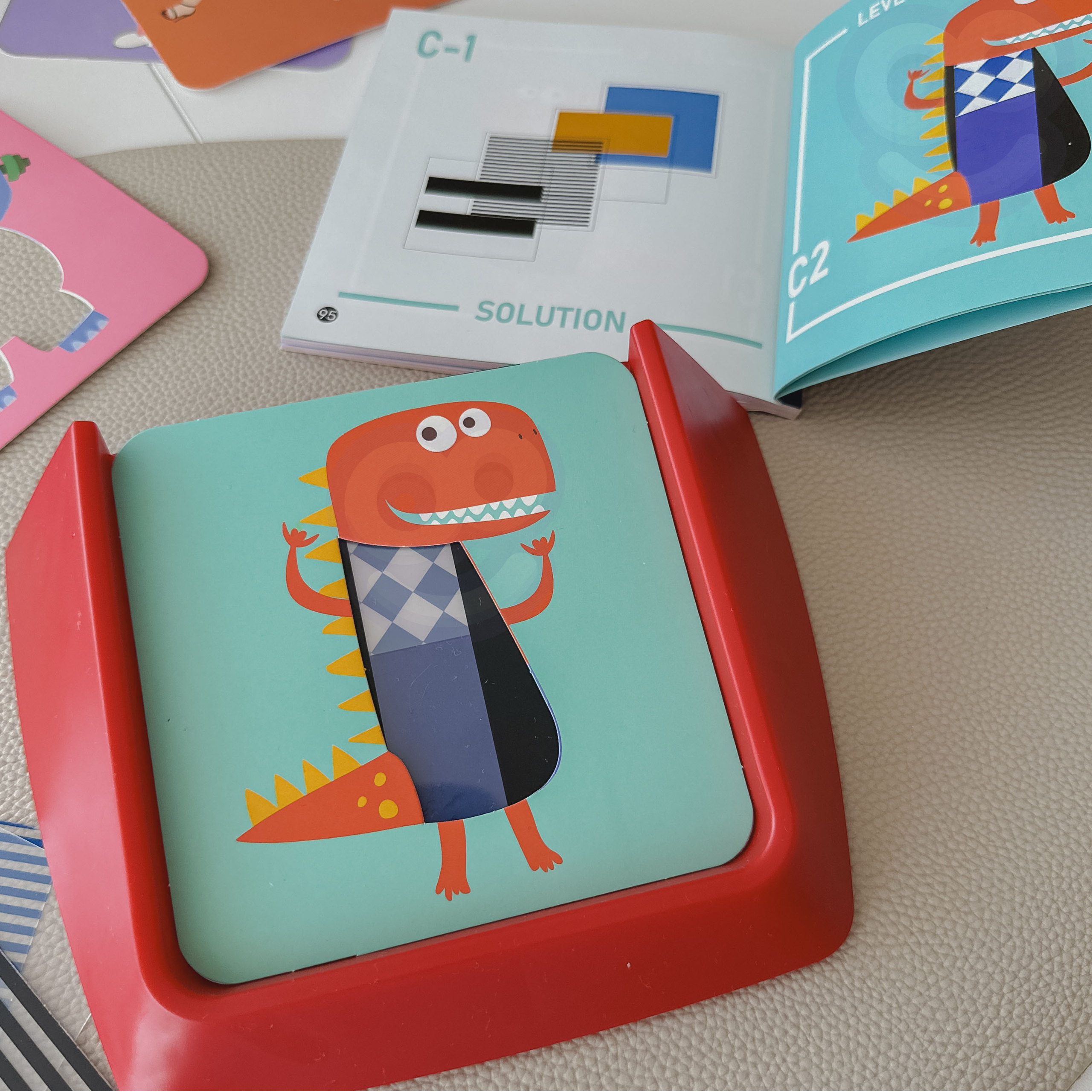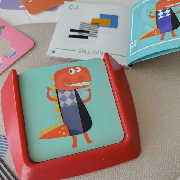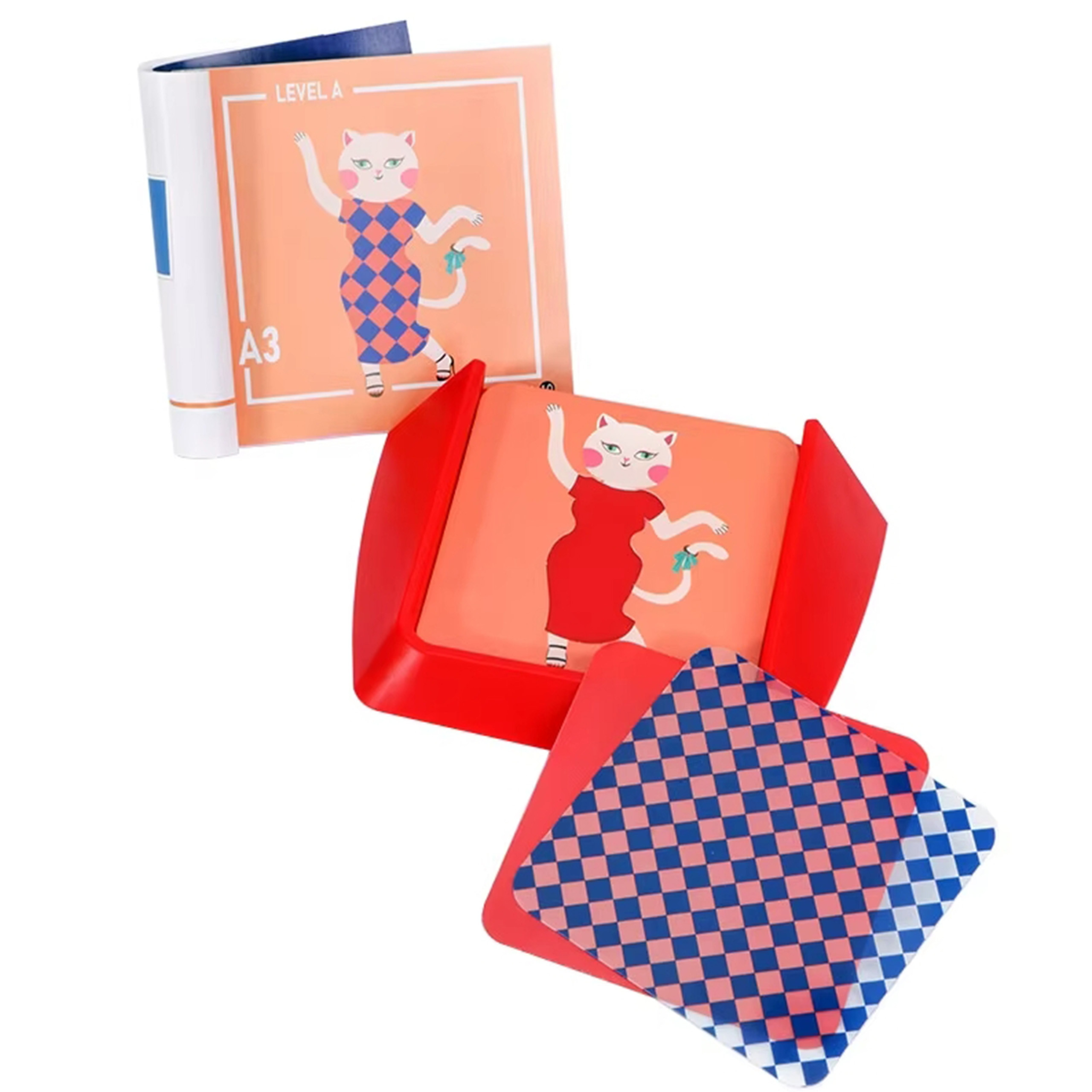- – W zestawie: stojak do gry, 4 szablony, 18 kart ze wzorami i książeczka z zadaniami