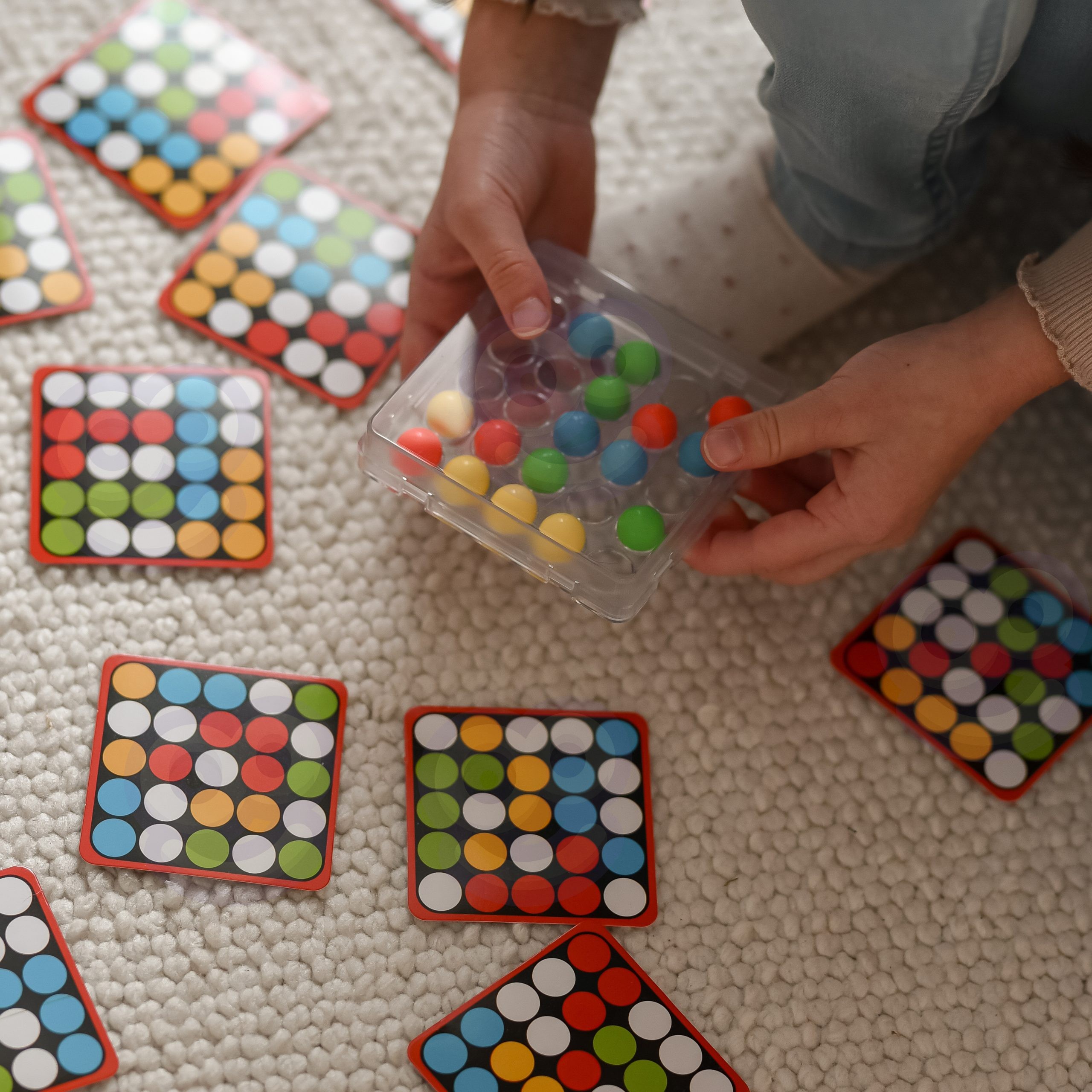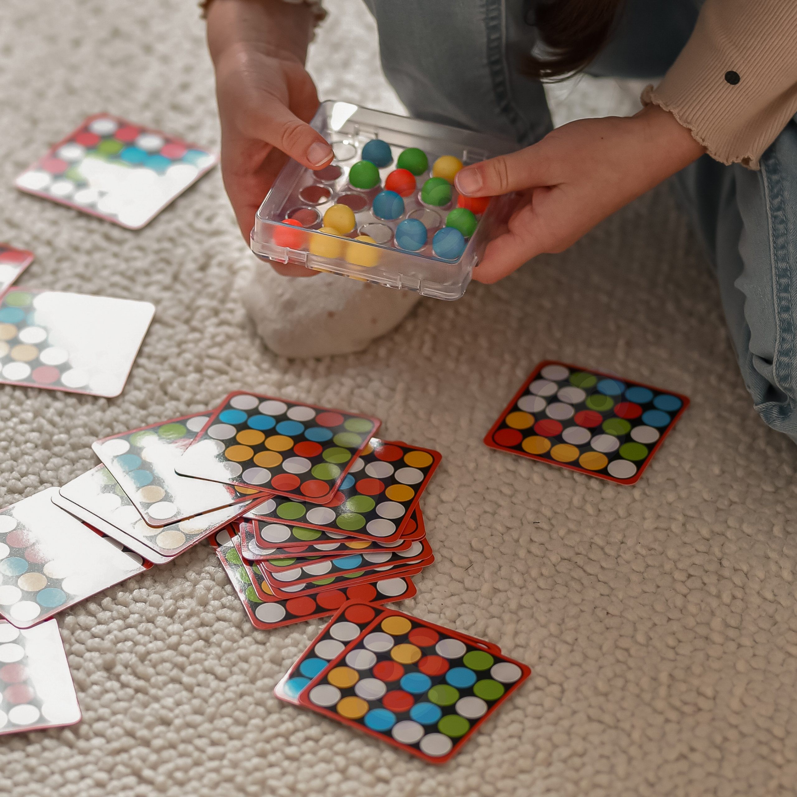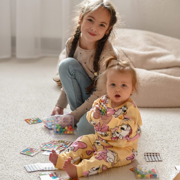 Podstawka z kolistymi otworami umożliwia przesuwanie kolorowych kulek w środku pudełka wyłącznie za pomocą palcy.Każda karta dodatkowo zawiera na odwrocie uniwersalny czarno-biały szablon do pokolorowania i stworzenia przez dzieci własnej mozaiki.