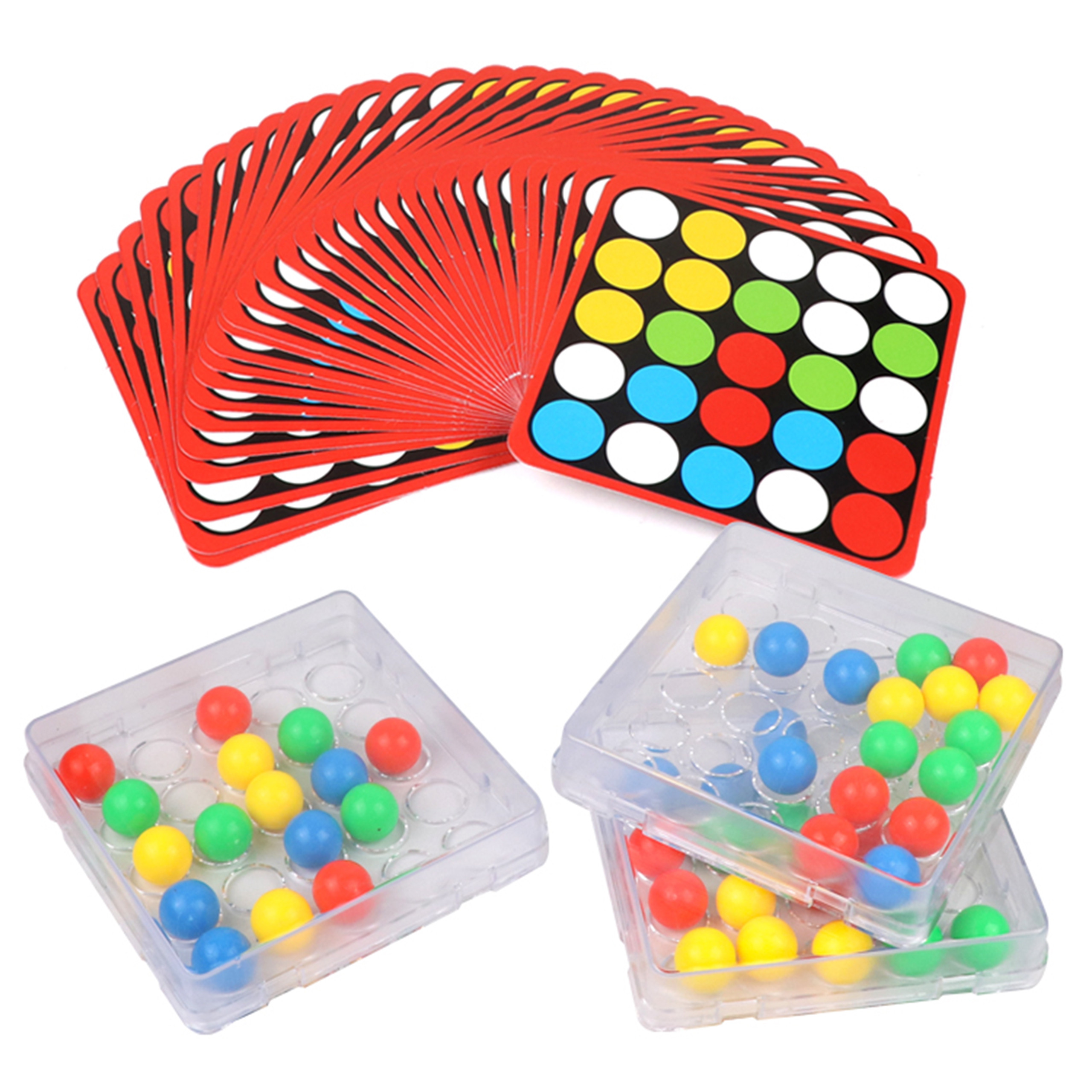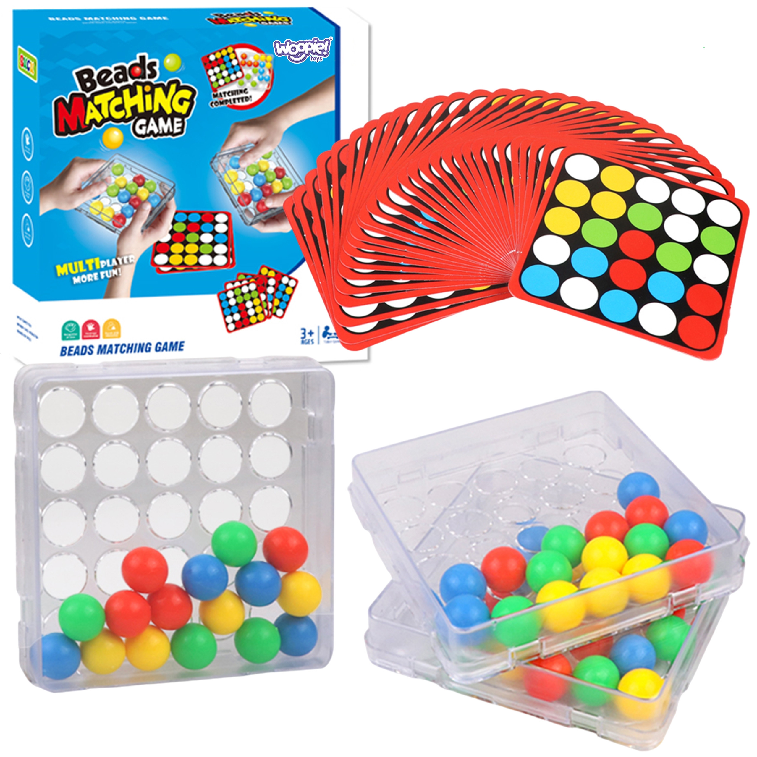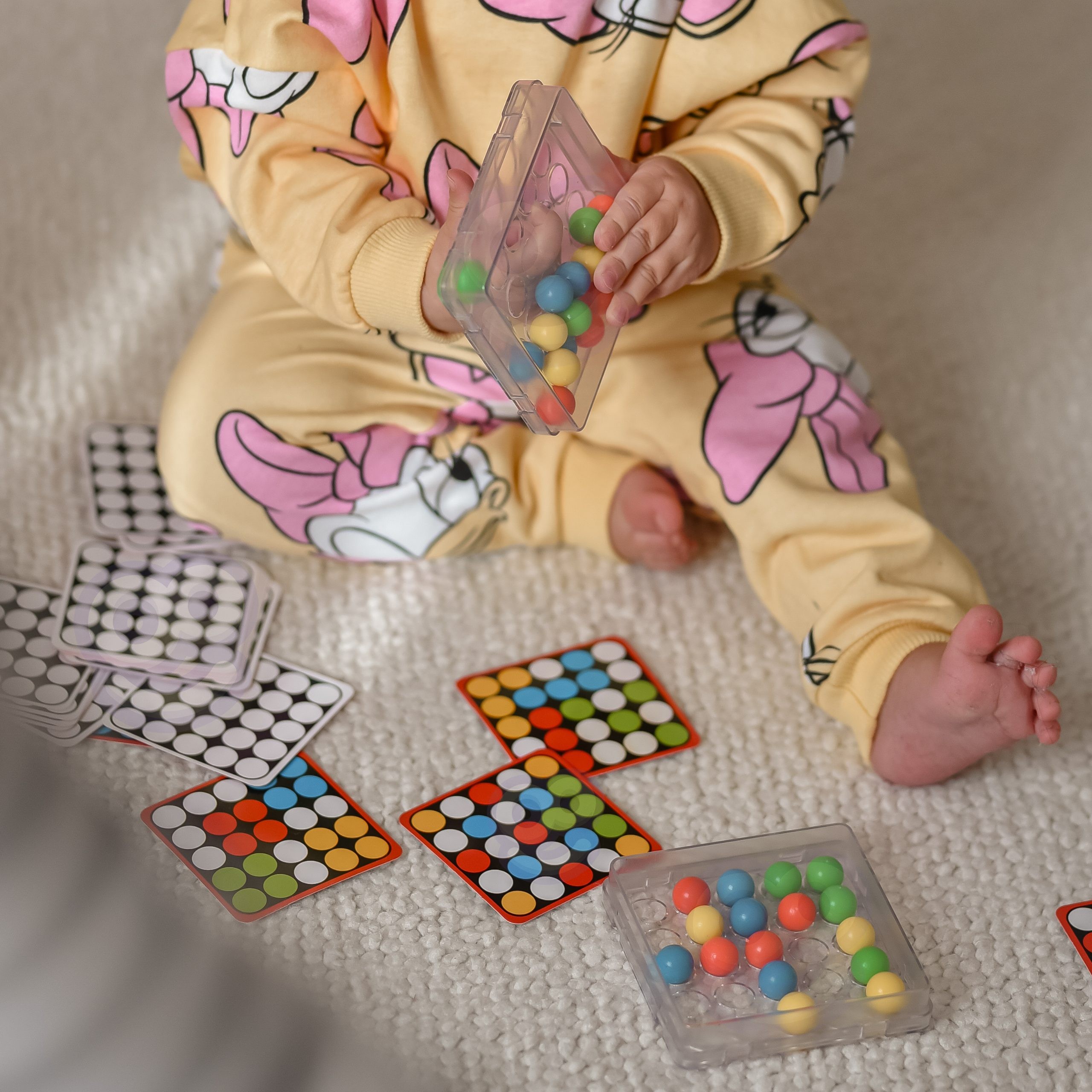 Podstawka z kolistymi otworami umożliwia przesuwanie kolorowych kulek w środku pudełka wyłącznie za pomocą palcy.Każda karta dodatkowo zawiera na odwrocie uniwersalny czarno-biały szablon do pokolorowania i stworzenia przez dzieci własnej mozaiki.