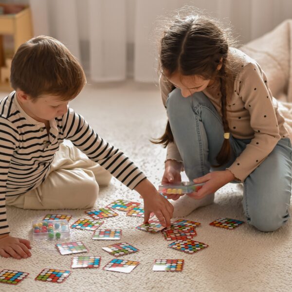 Dzieci analizują, planują i nanoszą kolory. Idealny zestaw do ćwiczenia percepcji wzrokowej, widzenia przestrzennego i wyobraźni.