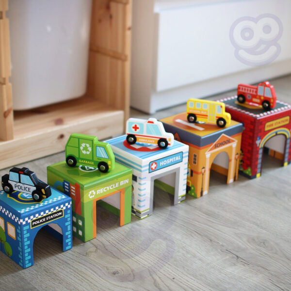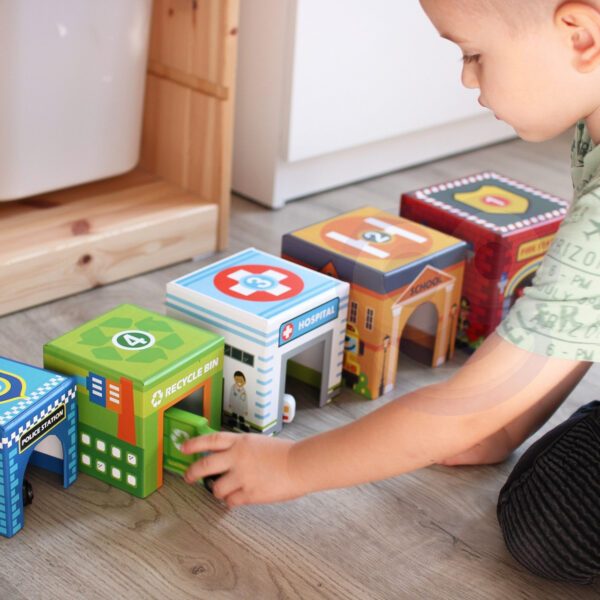 W zestawie znajdują się także urocze, drewniane samochodziki na gumowych kółkach, które dzieci mogą wpuszczać do wnętrza budynków przez specjalne otwory. To idealna okazja, by tworzyć własne historie i odgrywać codzienne scenki z życia miasta!