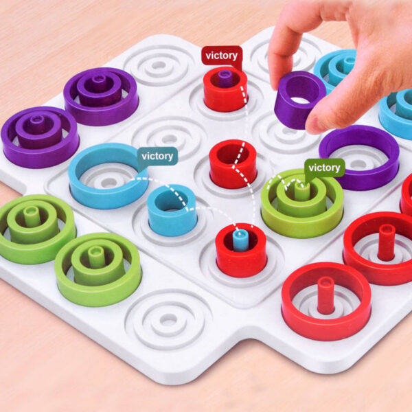 - Aby wygrać, należy ułożyć w jednej linii (pionowo, poziomo lub ukośnie): Trzy pionki tego samego koloru w kolejności: – Od największego do najmniejszego – Pionki tej samej wielkości – Od największego do najmniejszego