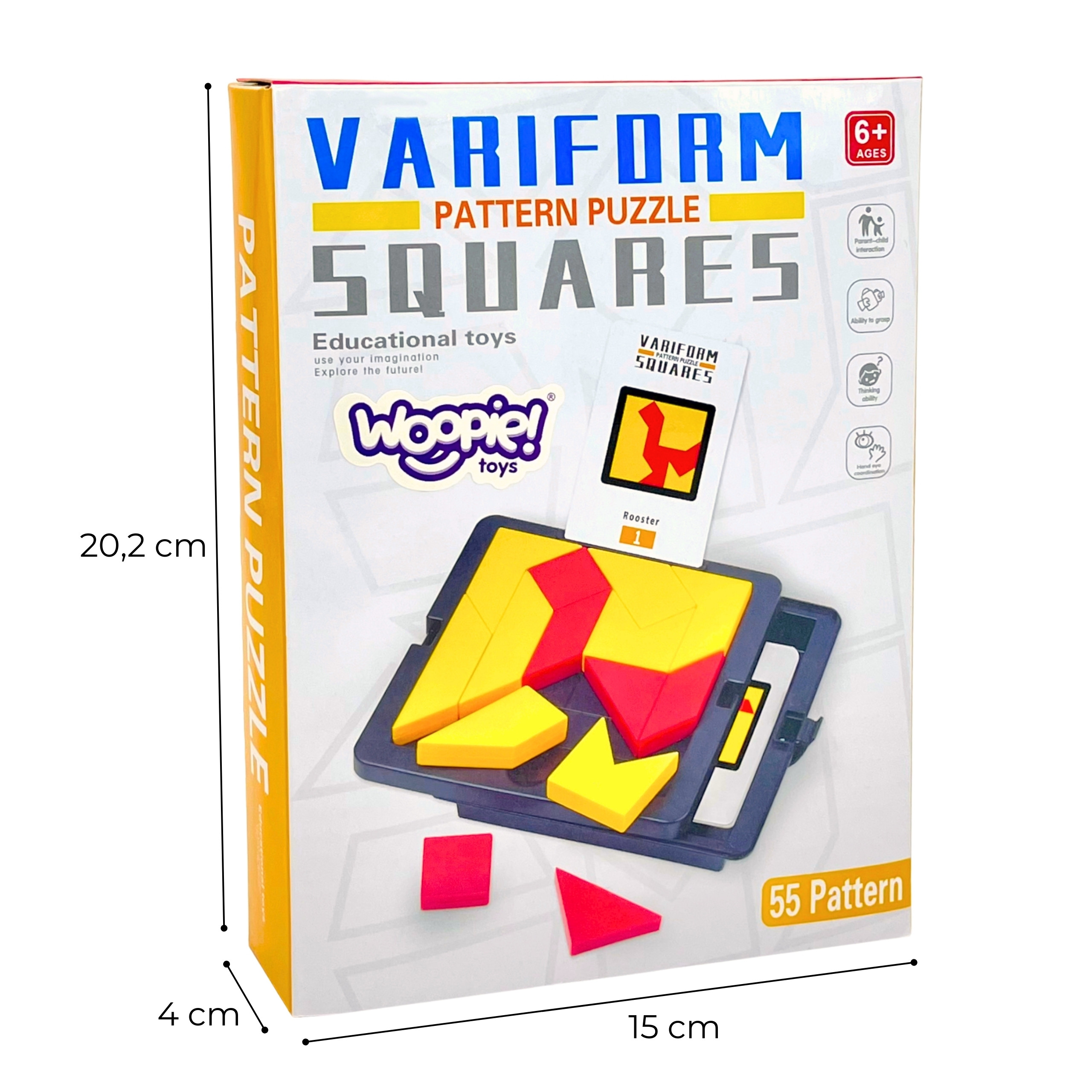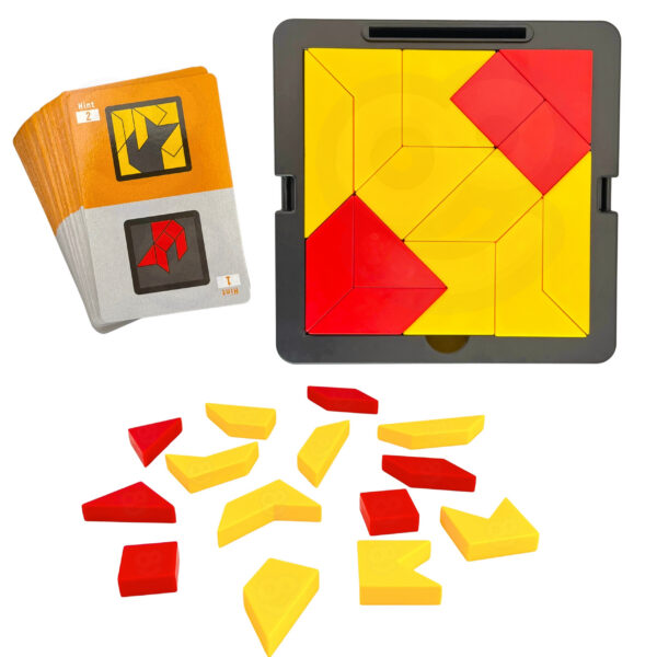 Tangram Gra Logiczna Kieszonkowa od firmy WOOPIE to gra, która pozwala rozwijać umiejętności spostrzegawcze jak i kreatywne. Celem gry jest ułożenie z dostępnych elementów określonych wzorów przedstawionych na kartach. Gracz musi dopasować klocki tak, aby odwzorować wzory, nie pozostawiając pustych miejsc ani nie nakładając elementów na siebie. Dziecko dzięki różnym drewnianym klockom może układać wiele wzorów, każdy w coraz to cięższej kategorii. Przez co może ono rozwijać wyobraźnie i ćwiczyć logiczne myślenie.Ta gra jest również ćwicząca pamięć dzięki dolnej szufladce, której można schować karty. Jest to gra dla osób w każdym wieku ! Przez jej kompaktową wielkości może posłużyć jako rozrywka podczas podróży jak i w domu. Idealna na prezent dla każdego.