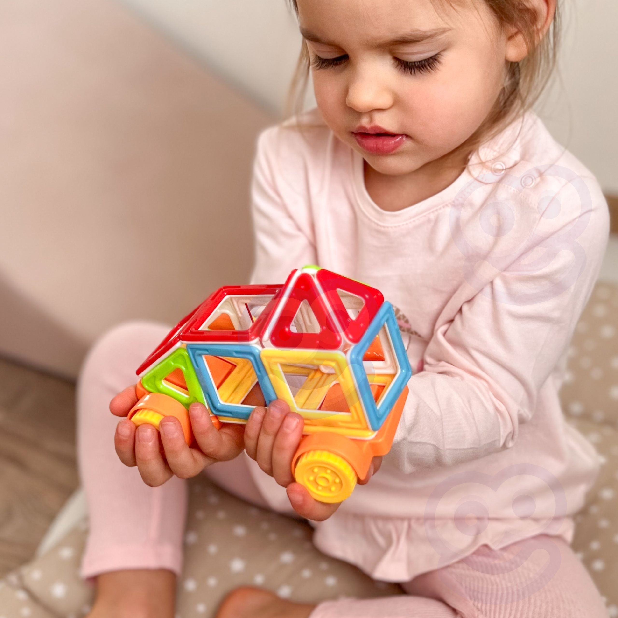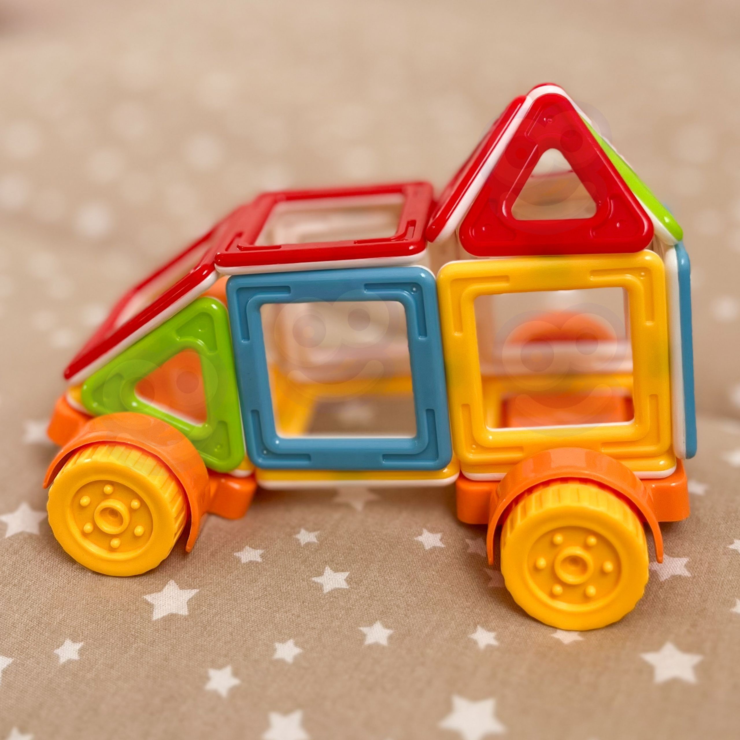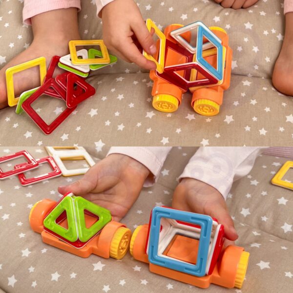 - – W zestawie znajdują się klocki geometryczne (kwadraty, trójkąty) i podstawa z kółkami.