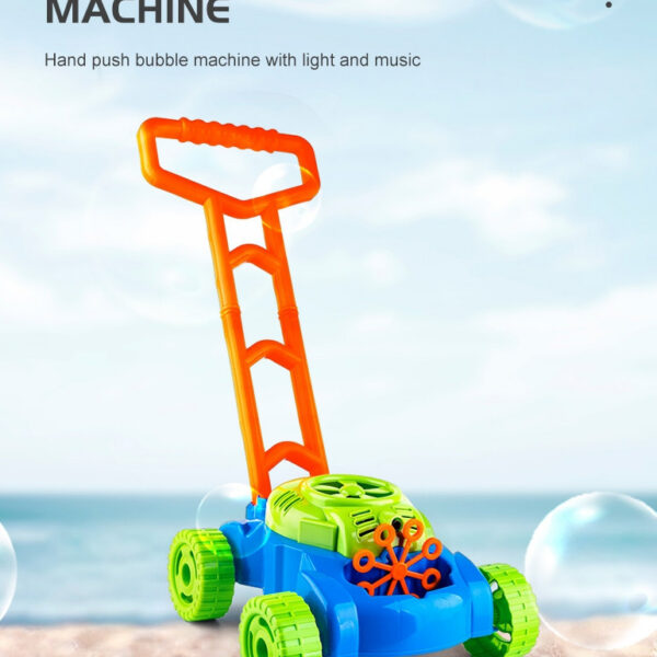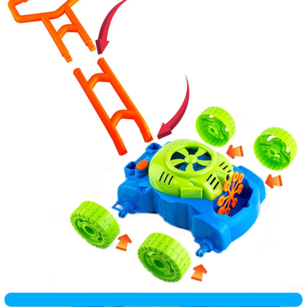 Bańki puszczane są automatycznie. Mały wiatraczek znajdujący się w górnej części obudowy silnika kosiarki, wytwarza strumień powietrza, który kierowany jest na 8 kręcących się pierścieni. Zanurzają się one w pojemniku na płyn do wytwarzania baniek i po kolei podsuwają pod małą dyszę. W ten sposób bańki puszczane są nieustannie. Dzięki 8 pierścieniom, zabawka wytwarza równocześnie dużą liczbę baniek. Dodatkową zaletą kosiarki są wydawane przez nią dźwięki. Dźwięki jakie możemy usłyszeć to dźwięk baniek mydlanych oraz melodia z bajki. Przy tylnych kółkach umieszczone zostały plastikowe zakładki, które podczas jazdy terkoczą imitując tym samym odgłos wydawany przez prawdziwe urządzenie. Bajecznie kolorowa kosiarka to propozycja niekończącej się zabawy, pobudzającej kreatywność i rozwijającej zdolności manualne. Możesz mieć pewność, że maluch nie będzie miał czasu na nudę.