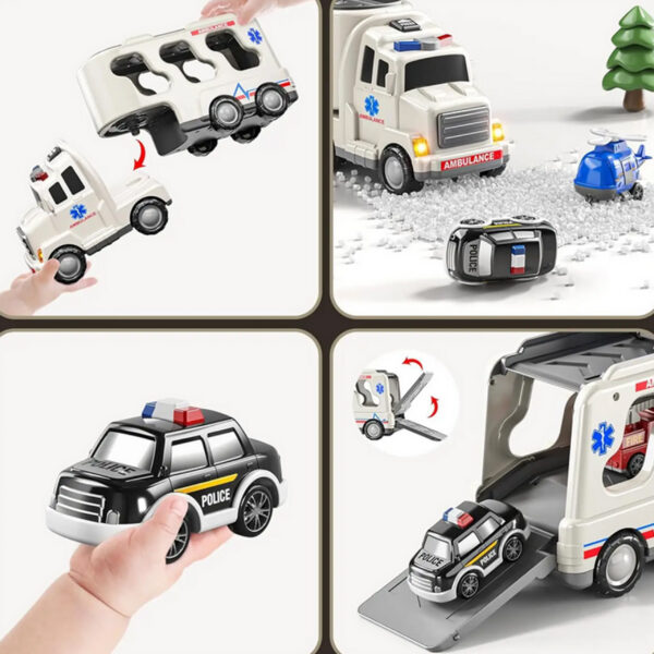 Duży Zestaw Ratunkowy Ciężarówka+4 Auta od Marki Woopie Zaprojektowana z myślą o małych pasjonatach straży pożarnej, policji,pogotowia ta zabawka 5 w 1 to idealny zestaw dla każdego małego ratownika! Naciśnij przycisk na górze kabiny ciężarówki, aby zobaczyć jasne migające światła i usłyszeć realistyczne syreny, bardzo atrakcyjne dla dzieci. Zestaw zawiera dużą ciężarówkę transportową oraz cztery pojazdy ratunkowe: samochód strażacki, radiowóz, helikopter policyjny, karete. Każdy z pojazdów ma ruchome elementy, które pozwolą Twojemu dziecku poczuć się jak prawdziwy bohater podczas akcji ratunkowych! Zestaw jest świetnym pomysłem na prezent urodzinowy, świąteczny czy na inne okazje.